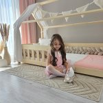 Pat copii montessori tip casuta, LittleAmy, Angel Nest, Balustrade cu bare plate, Natur, 90 x 180 cm