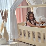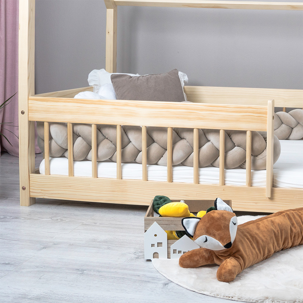 Pat copii montessori tip casuta, LittleAmy, Angel Nest, Balustrade cu bare rotunde, Natur, 100 x 180 cm