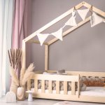 Pat pentru copii Montessori tip casuta, LittleAmy, Cozi Cottage, balustrade cu bare plate, Natur, 120 x 200 cm