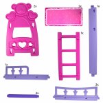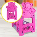 O scară roz fermecătoare duce la nivelul superior, care nu este doar un plus estetic, ci și un element practic al structurii. Datorită acesteia, copilul poate „adoarmi păpușa” cu ușurință pe patul de sus, învățând să organizeze spațiul și să gândească logic. Scara dezvoltă și abilitățile manuale atunci când copilul manevrează ușor păpușa de-a lungul treptelor. Aceasta este soluția perfectă care face distracția și mai captivantă și mai realistă.