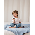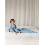 Confecționată din 50% bambus și 50% bumbac, păturica îl va ajuta pe micuț să se simtă confortabil în zilele reci de iarnă sau nopțile răcoroase de vară. Textura fină, alături de nuanța pastelată de albastru, se integrează armonios în orice decor din camera copilului.