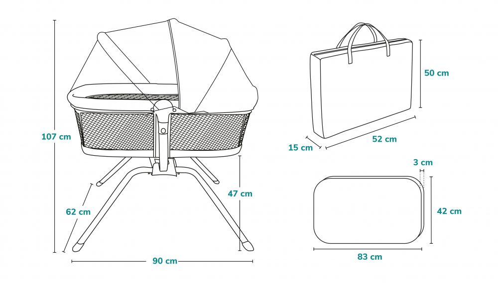 Patutul este perfect in timp ce calatoriti impreuna. Alaturi de saltea, produsul se poate potrivi în geanta de transport inclusă în set (trollerul este cu titlu de prezentare). Un sistem simplu de instalare, lipsit de unelte și picioare click-click, permit plierea și desfacerea rapidă. Husa pentru pătuț și husa de saltea pot fi îndepărtate și spălate pentru a le păstra curate și proaspete pentru o perioadă lungă de timp.