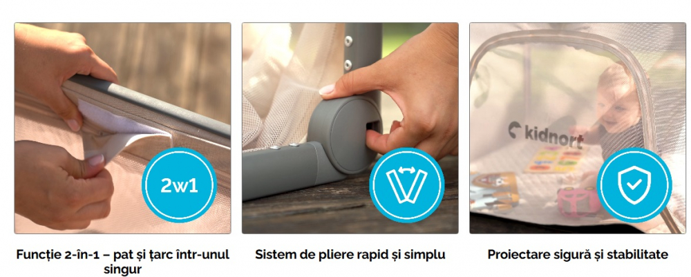 Picioare: Produsul este dotat cu picioare antiderapante si stabile, care garanteaza siguranta in timpul somnului si al jocului.