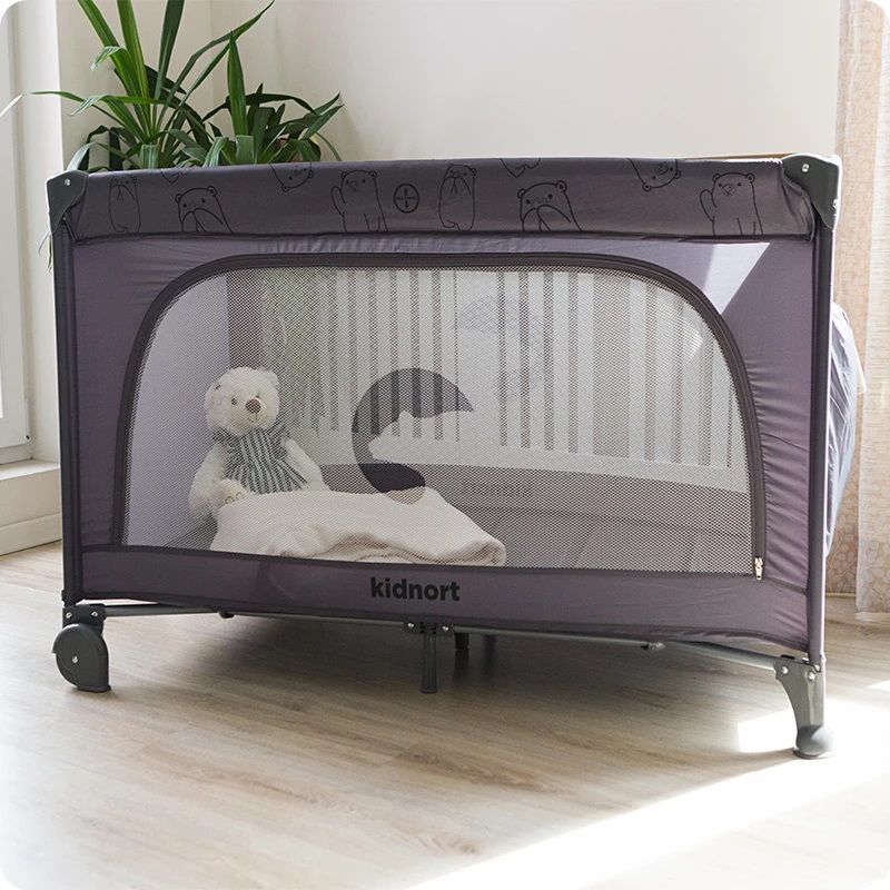 Patut de calatorie cu saltea, plasa de ventilatie, roti, usa cu fermoar si geanta de transport Kidnort Grotta Dark Grey