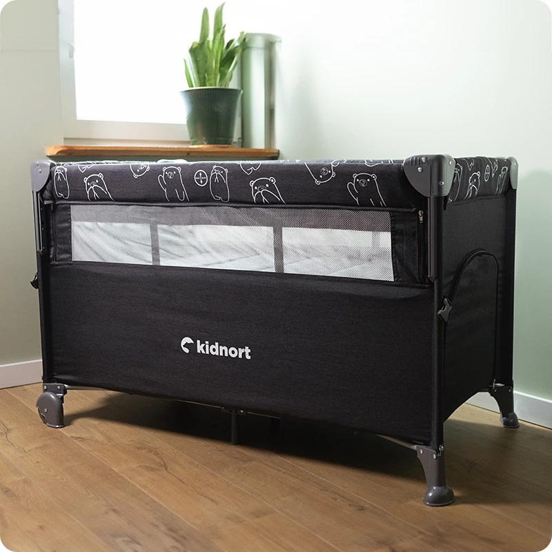 Patut de calatorie multifunctional 3 in 1 Naste Dark Grey cu laterala culisanta si 2 niveluri de inaltime, sistem atasare la patul parintilor, cu saltea si geanta de transport, dimensiune compacta, Intrare laterala, 9.3 kg