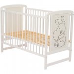 Patut din lemn cu roti Timmi Heart Qmini 120x60 cm din lemn de pin mdf somiera reglabila alb