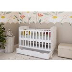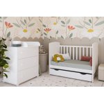 Patut din lemn Nichiduta Philip Alb 120x60 cm cu Laterala detasabila,Sertar cu roti,Margine din silicon pentru protectie dintisori,Design elegant,Vopsele si materiale sigure,3 Nivele reglare somiera,Margini rotunjite