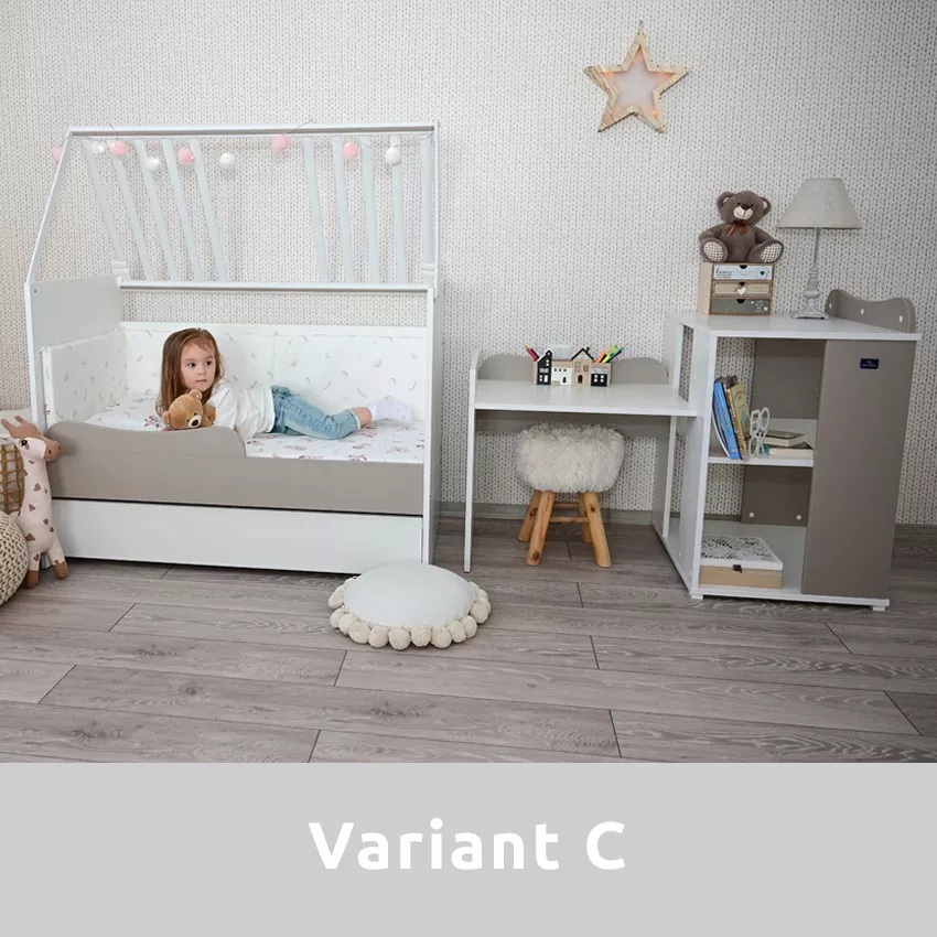 - patuţul pentru nou-născut este de dimensiuni de 60x120 cm, cu grilă culisantă pe două nivele, o comodă mare convenabilă cu trei rafturi și o masă de înfășat, cu opțiunea de asamblare pe stânga cât și pe dreapta.