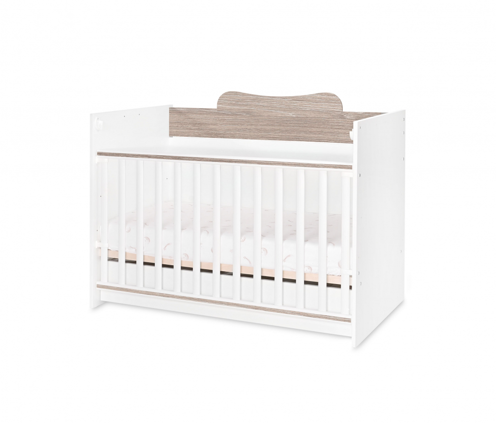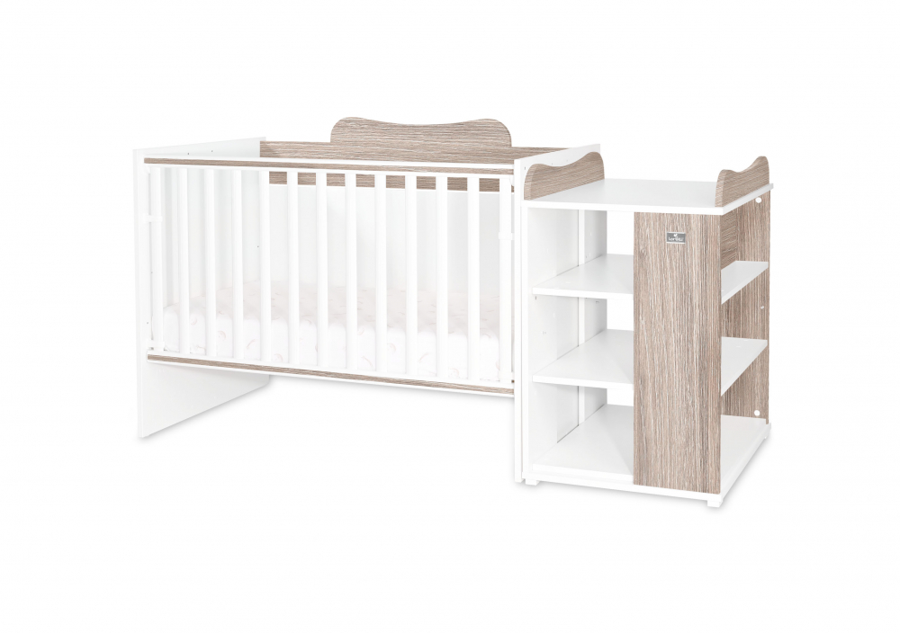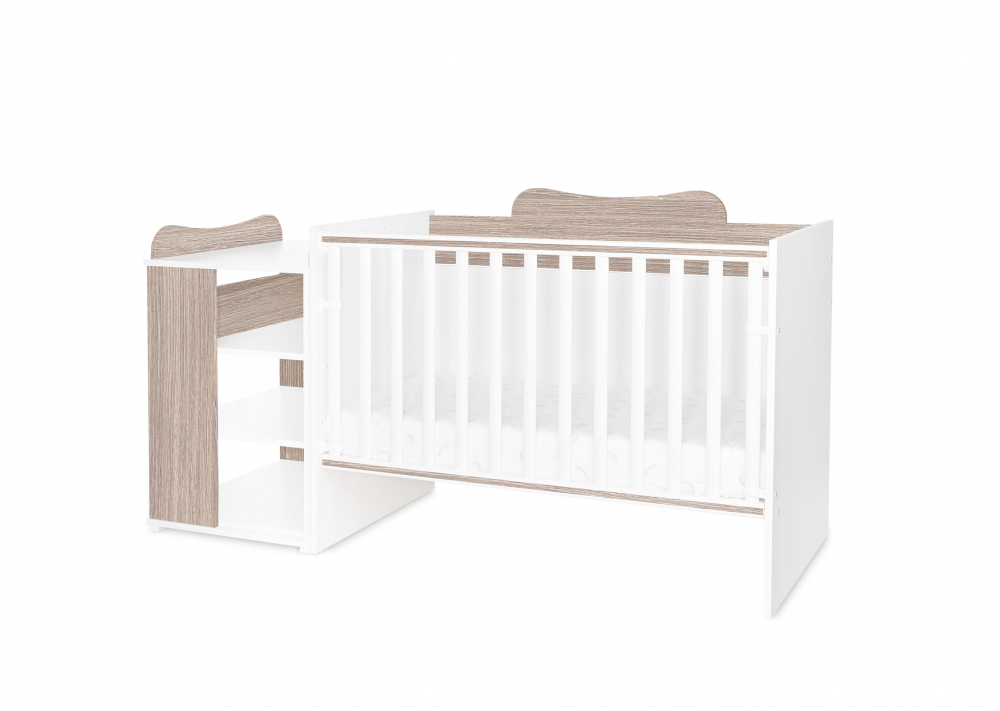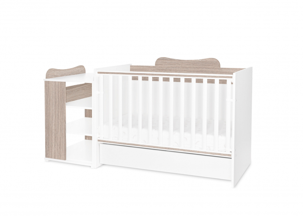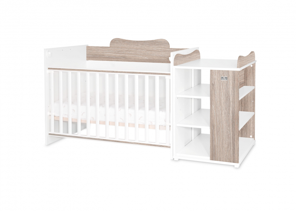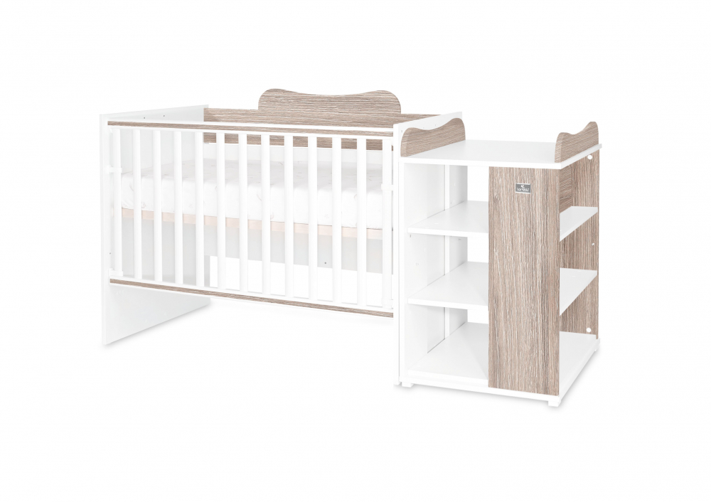 - patuţul pentru nou-născut este de dimensiuni de 60x120 cm, cu grilă culisantă pe două nivele, o comodă mare convenabilă cu trei rafturi și o masă de înfășat, cu opțiunea de asamblare pe stânga cât și pe dreapta.