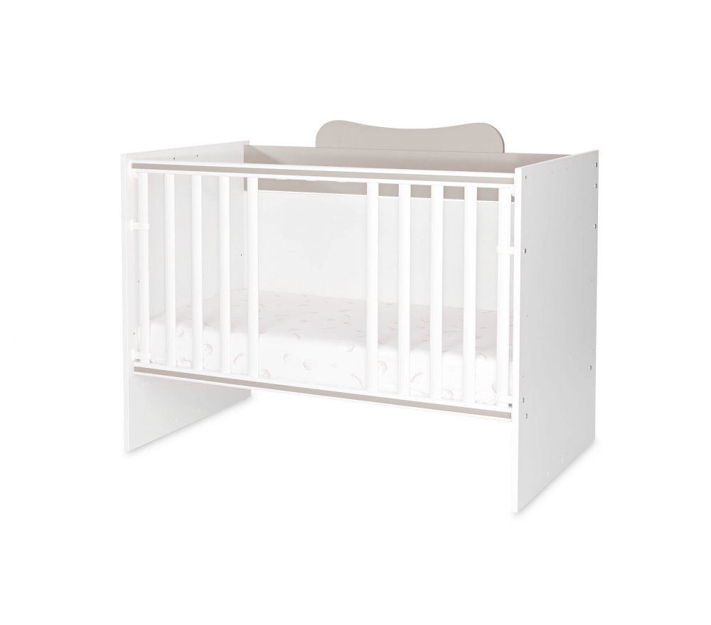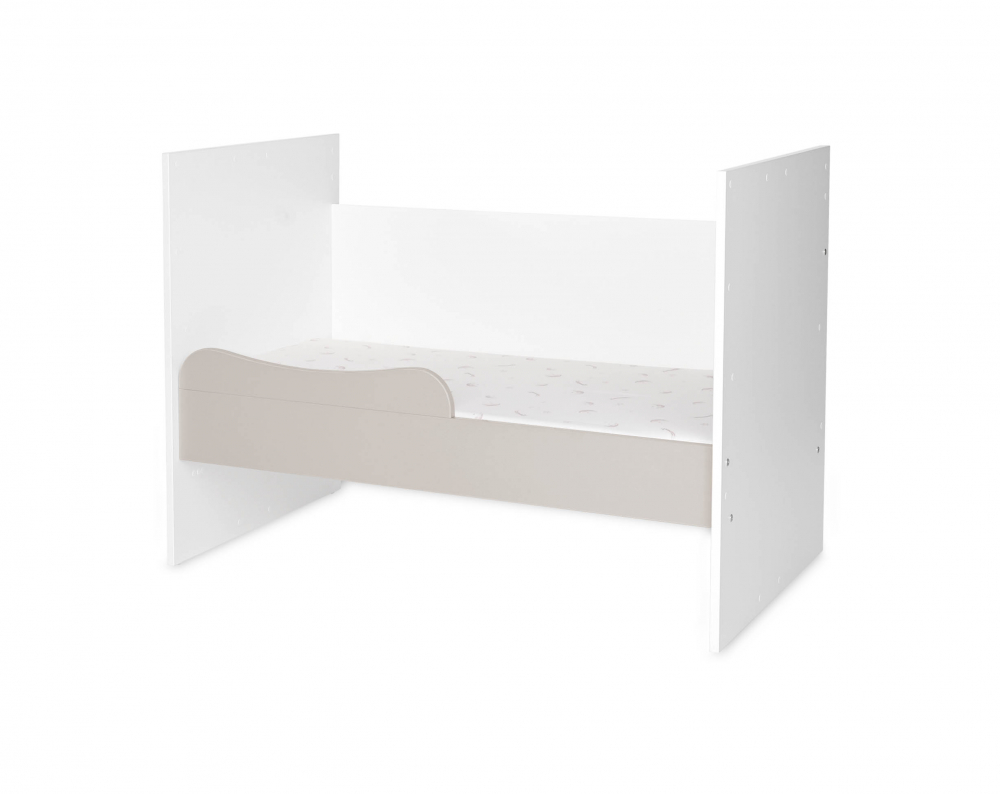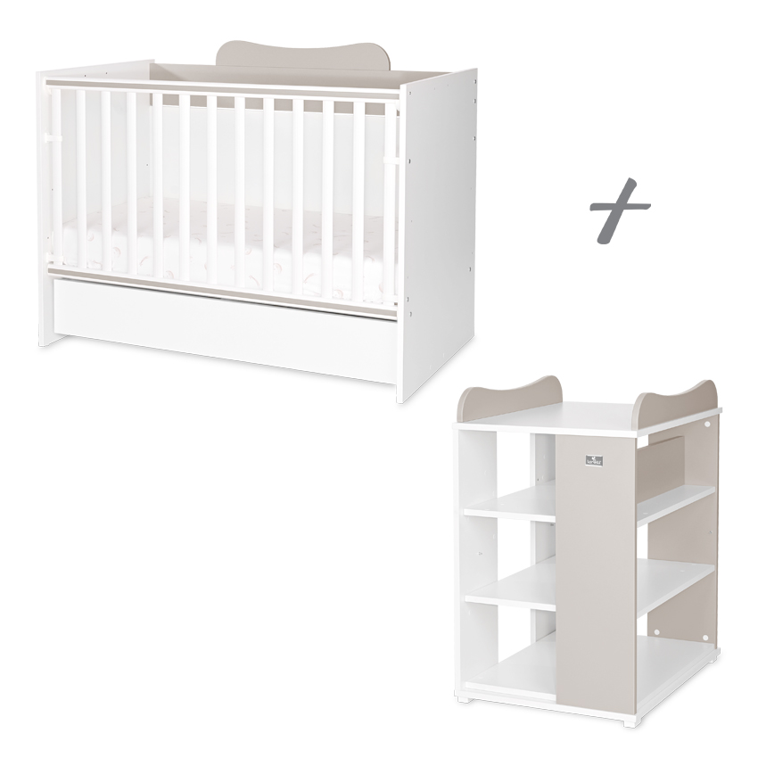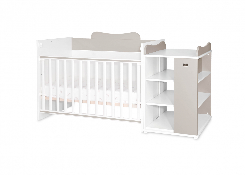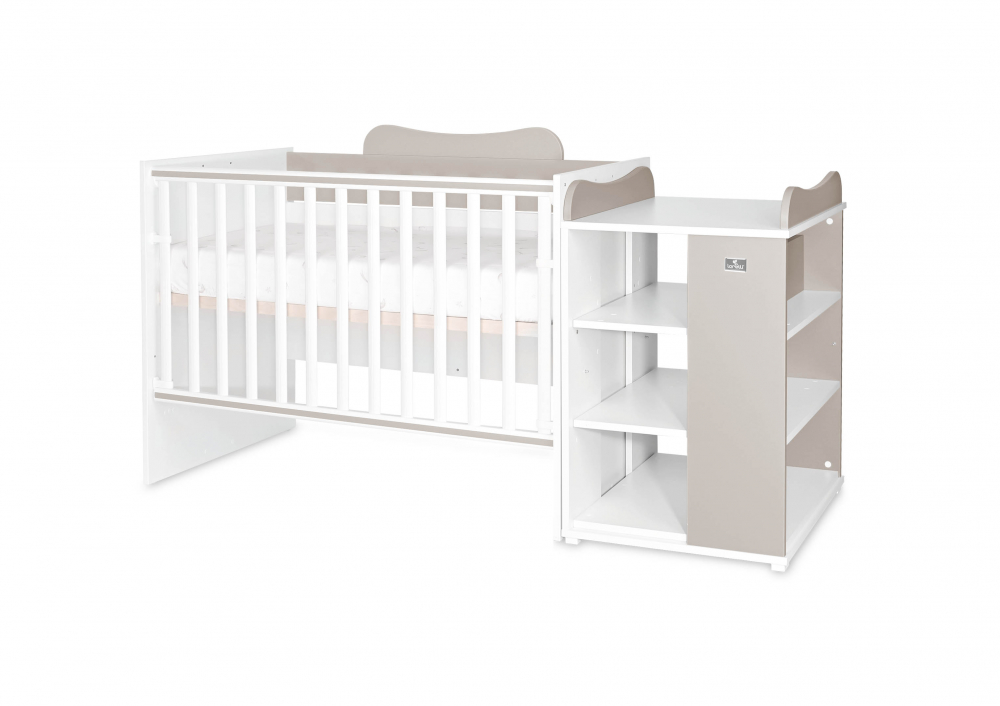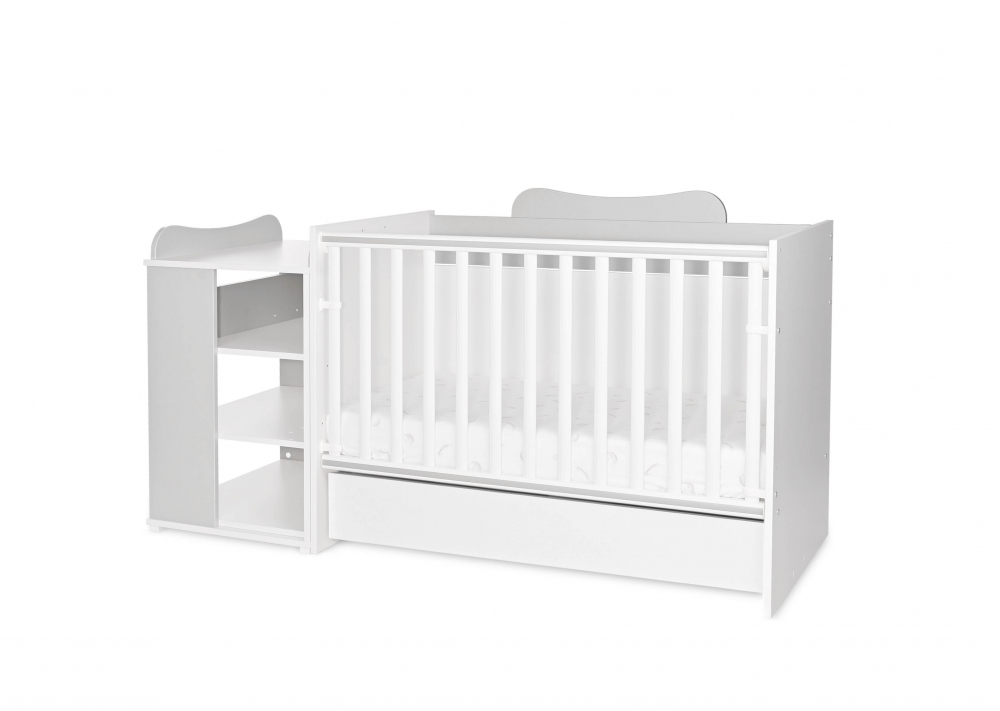 - patuţul pentru nou-născut este de dimensiuni de 60x120 cm, cu grilă culisantă pe două nivele, o comodă mare convenabilă cu trei rafturi și o masă de înfășat, cu opțiunea de asamblare pe stânga cât și pe dreapta.