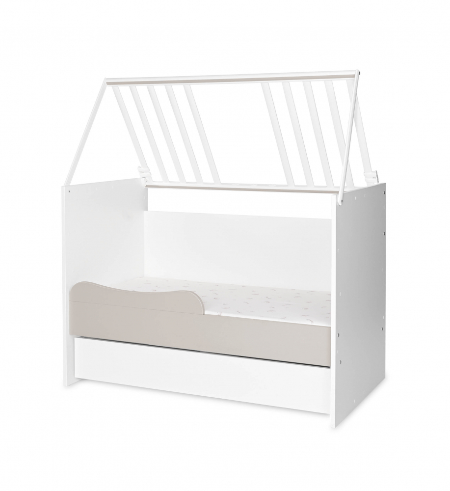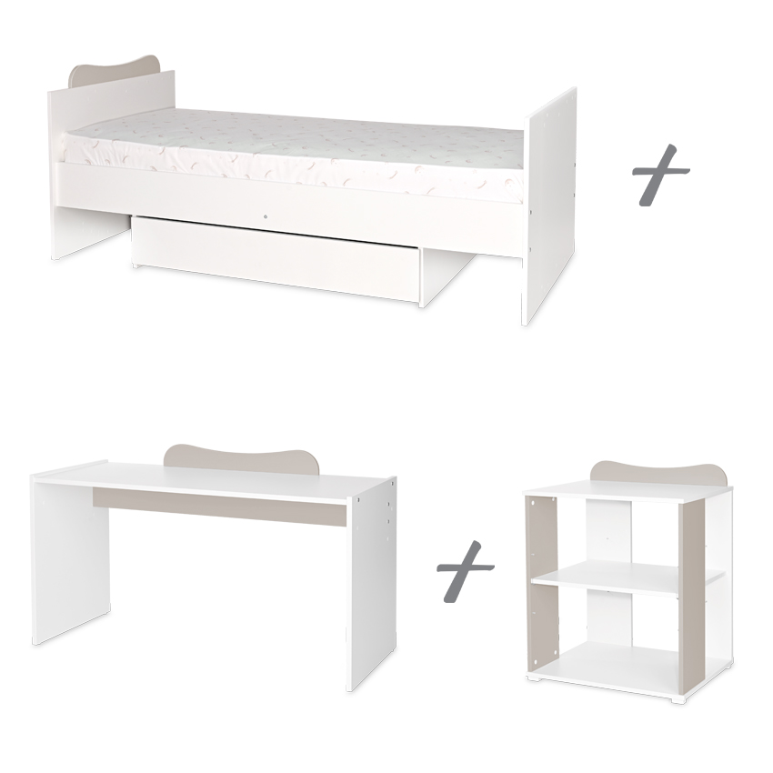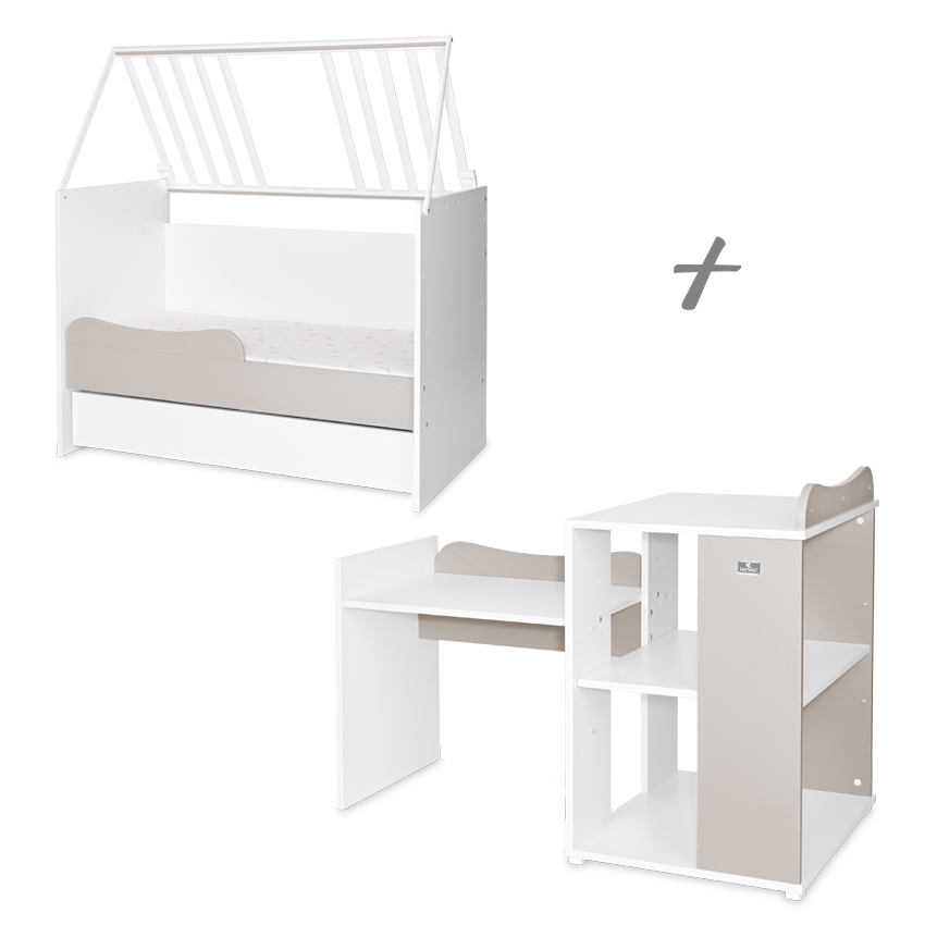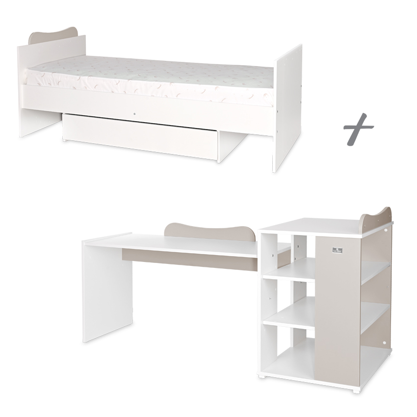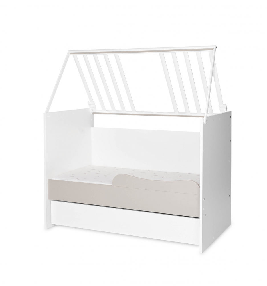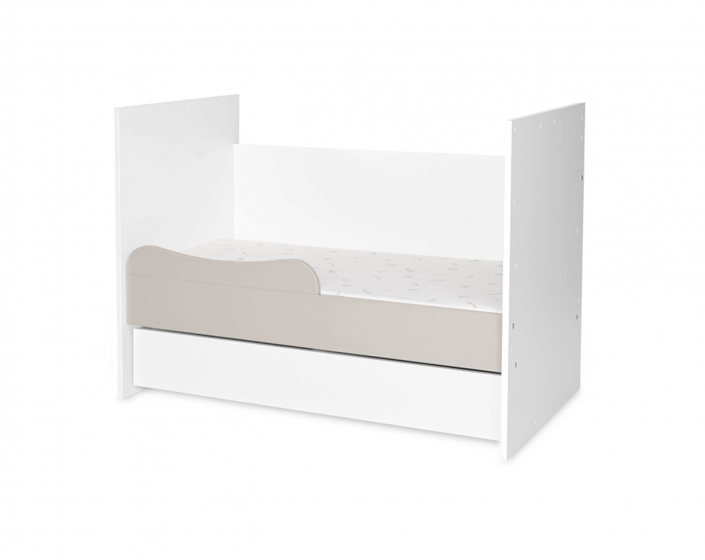 - patuţul pentru nou-născut este de dimensiuni de 60x120 cm, cu grilă culisantă pe două nivele, o comodă mare convenabilă cu trei rafturi și o masă de înfășat, cu opțiunea de asamblare pe stânga cât și pe dreapta.