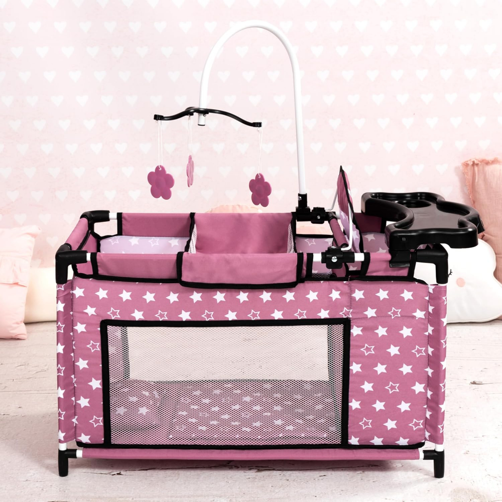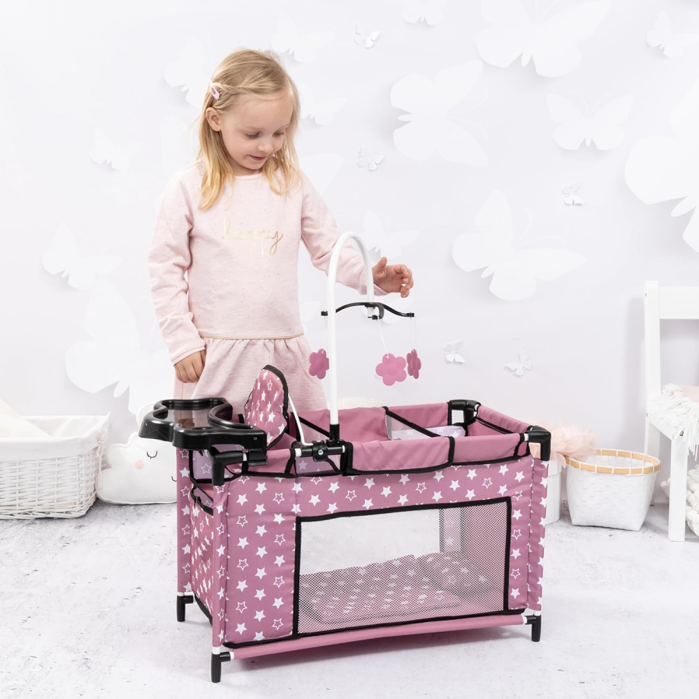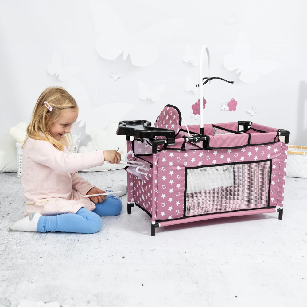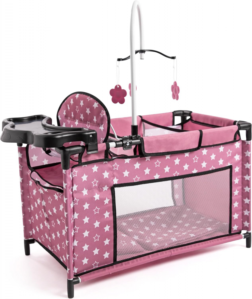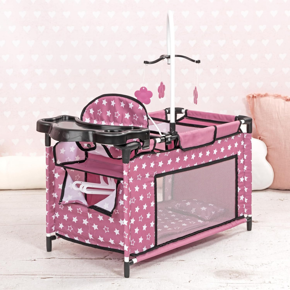 Patut multifunctional 2in1 de calatorie pentru papusi Bayer Stars Pink,scaun de masa incorporat cu masuta,carusel cu jucarii,masuta de infasat,plapumioara si pernuta incluse,pentru papusi de pana la 46cm