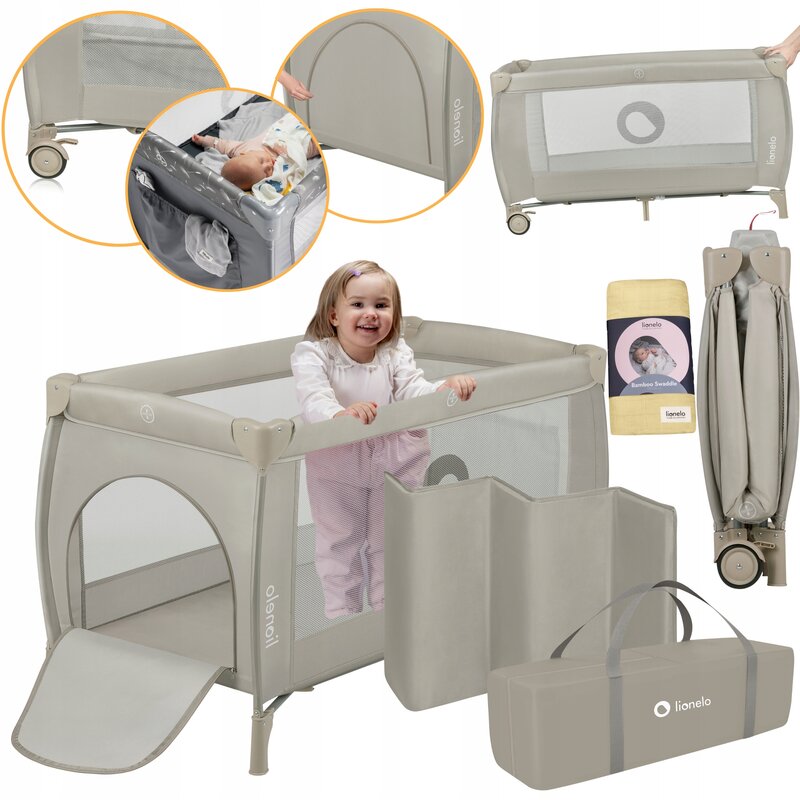Patut pentru copii Lionelo Stefi Plus Bej Pliabil, Cu doua nivele, Intrare laterala cu fermoar, 2 roti, 120 x 60 cm, Conform cu standardul european de securitate EN 716