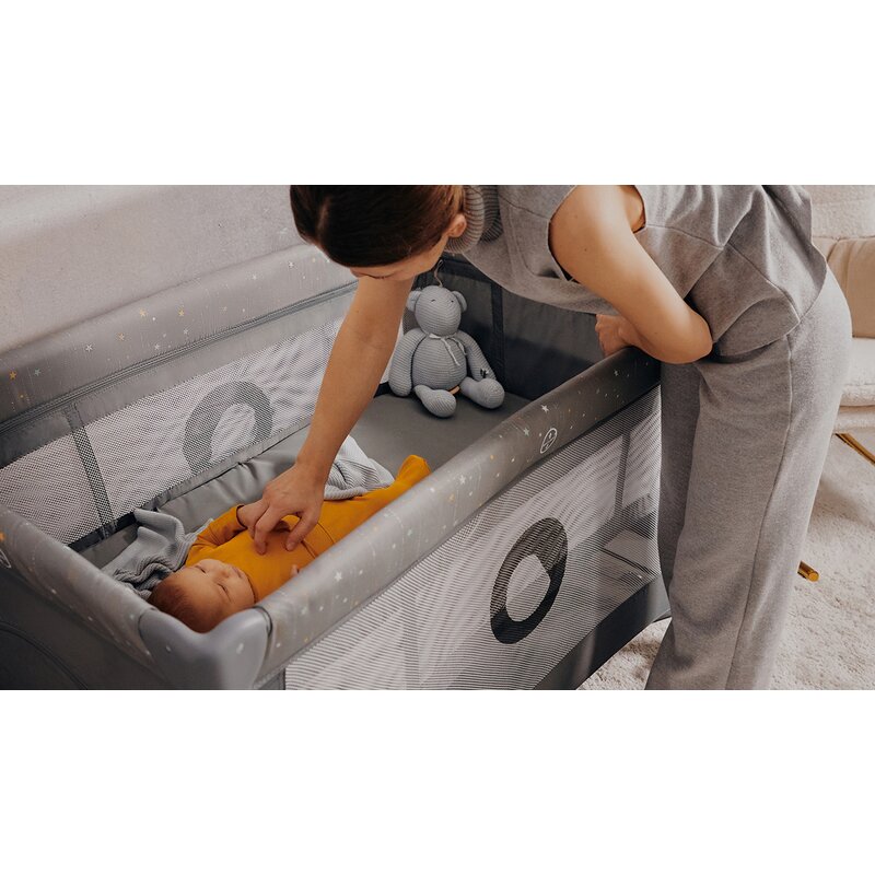 Modelul Stefi Plus este un spatiu sigur si confortabil pentru relaxare si joaca. Dispune de un buzunar practic pentru jucarii si o intrare laterala, ideala pentru copiii mai mari. Aceasta protejeaza spatele parintilor si adauga un plus de distractie. Husa patutului este usor de curatat, astfel incat explorarea lumii sa fie mereu igienica si sigura.