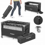 Patut pliabil 3 in 1 pentru copii, Kidnort, cu doua nivele, laterala culisanta, plasa de ventilatie, cu saltea si geanta de transport incluse, dimensiune 128 x 78.5 x 68 cm, Livsmiljo Dark Grey