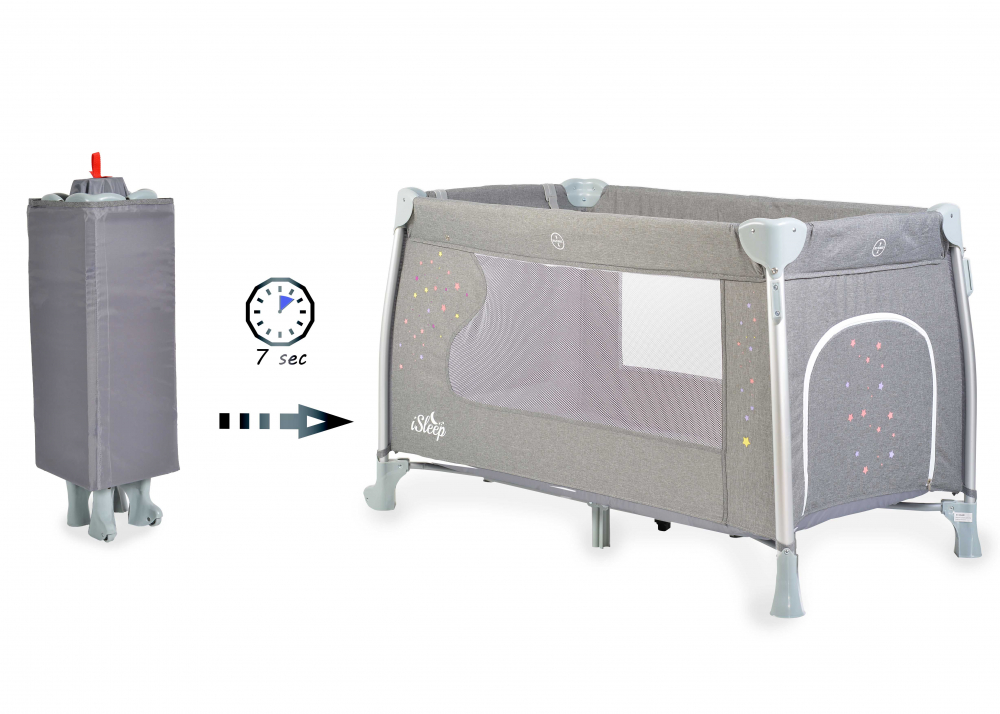 Patutul pliabil I Sleep se poate monta si demonta foarte rapid cu o singura mana in doar cateva secunde fiind ideal atat pentru calatorii cat si pentru acasa.