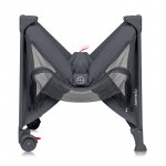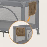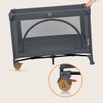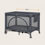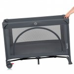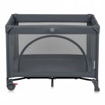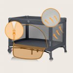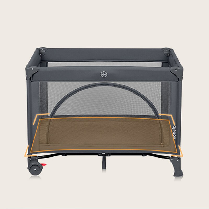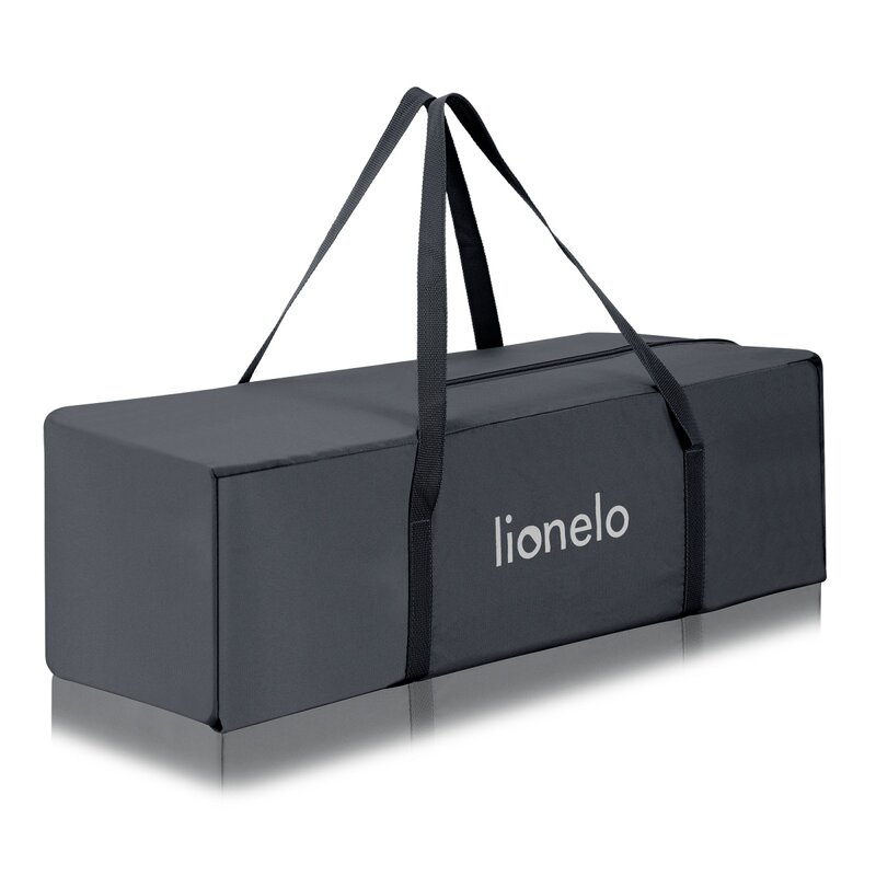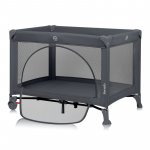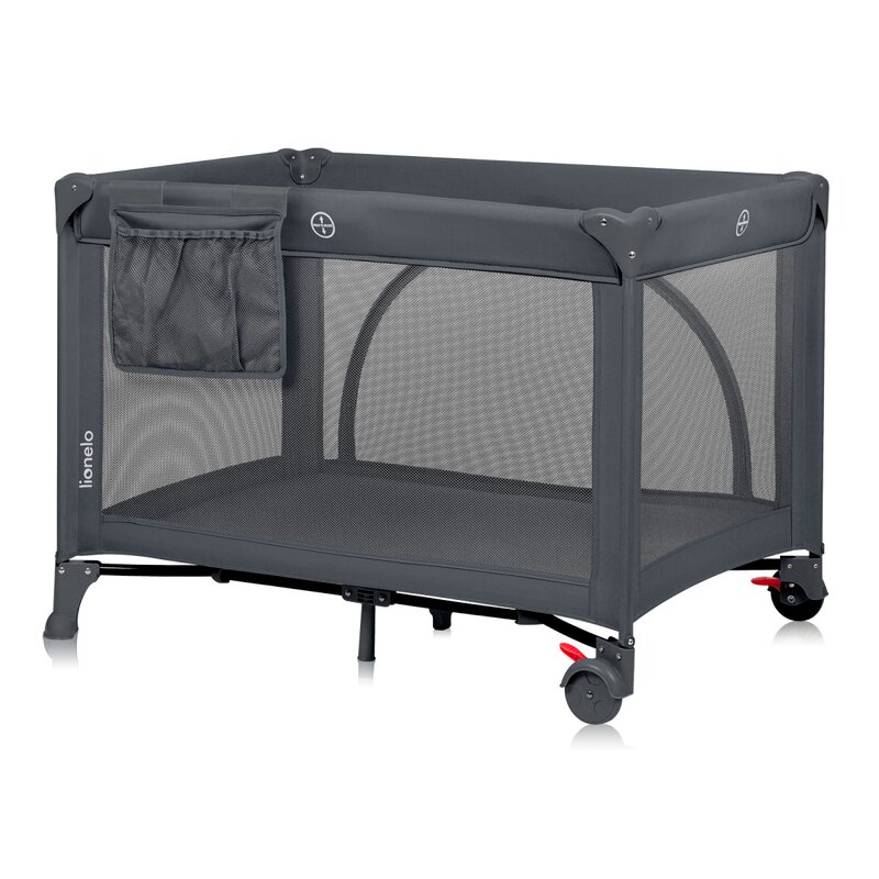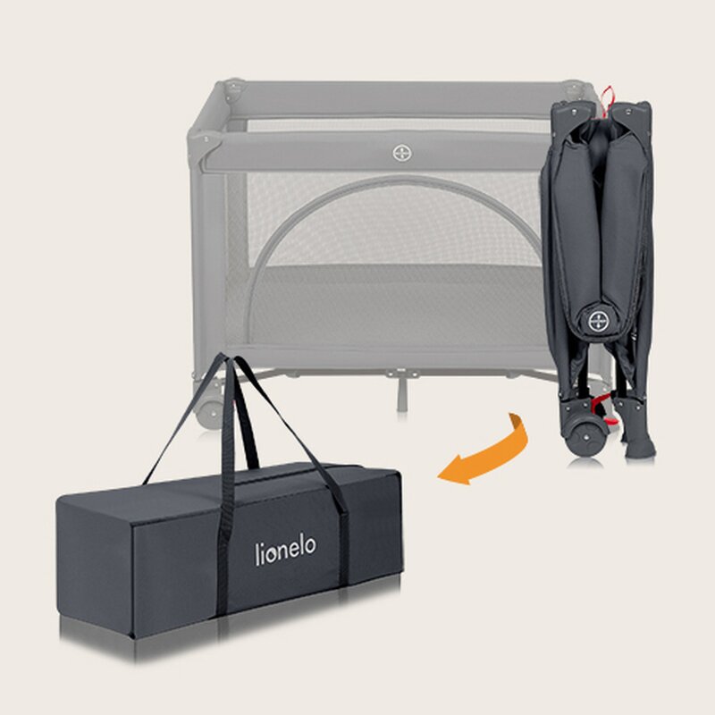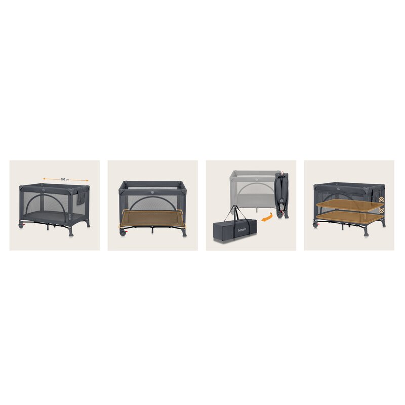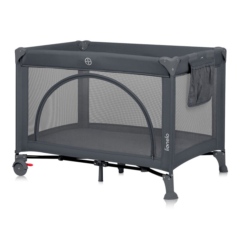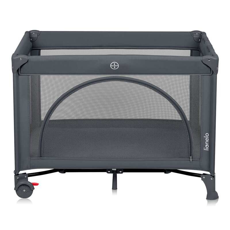 Patut pliabil, Lionelo, Laura, 102 x 74 cm, Cu doua nivele, Functie de tarc, Cu roti, Include salteluta si geanta de transport, Pereti din plasa, Deschidere laterala, Pana la 15 kg, 0 luni +, Gri
