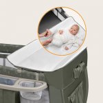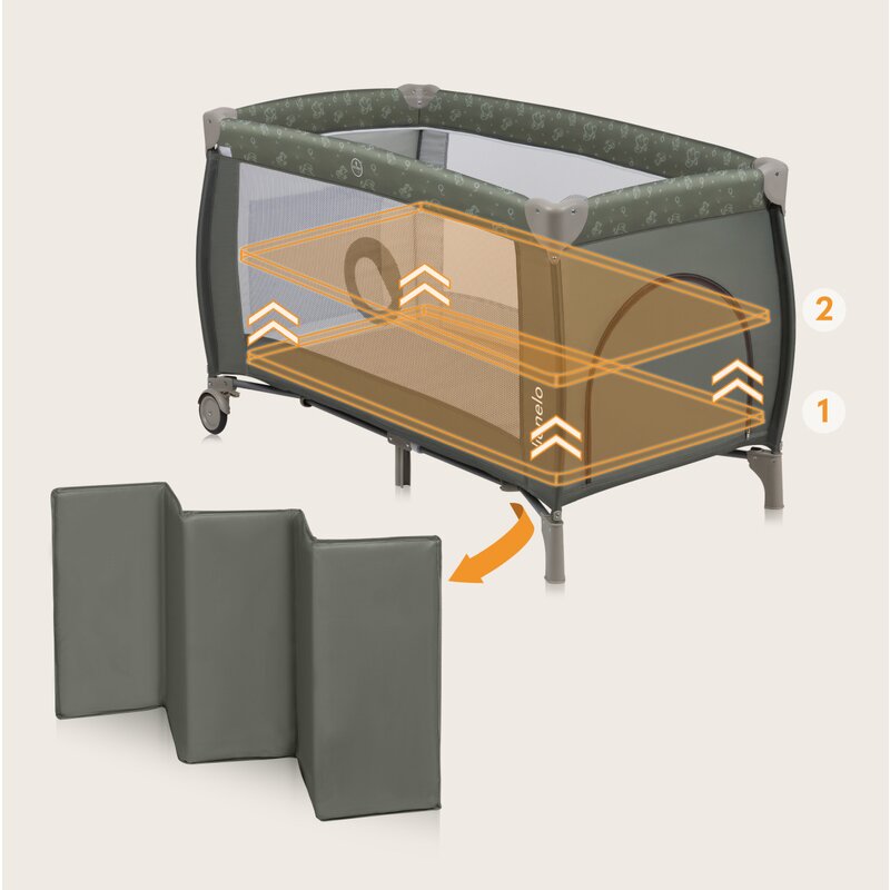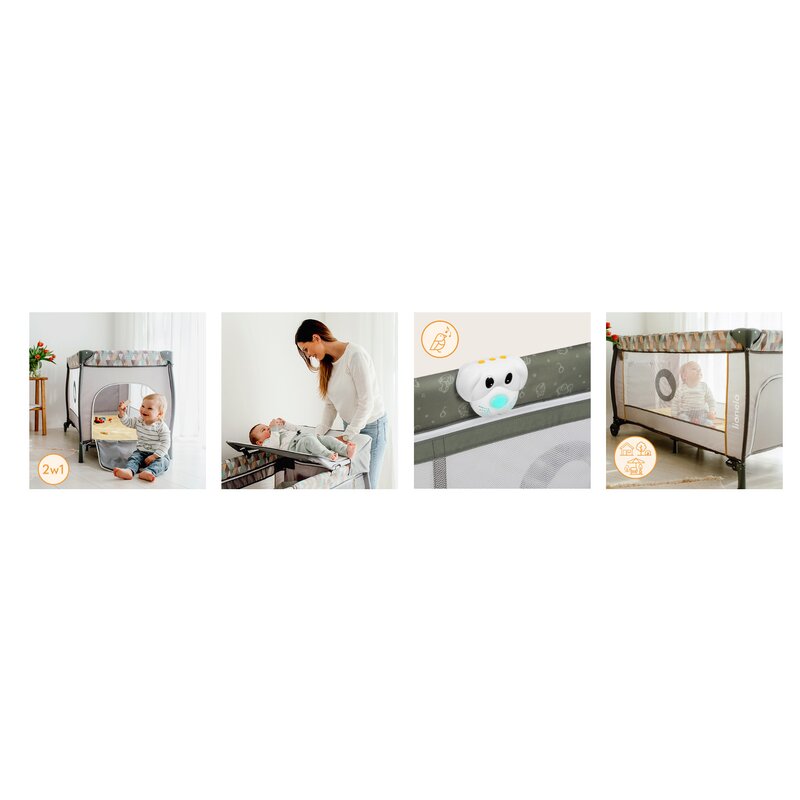 Patut pliabil, Lionelo, Sven Plus, 120x60 cm, Cu doua nivele, Cu arcada jucarii, masuta de infasat, vibratii, melodii, conform cu standardele europeane de securitate EN716 si EN12221, Bej Olive