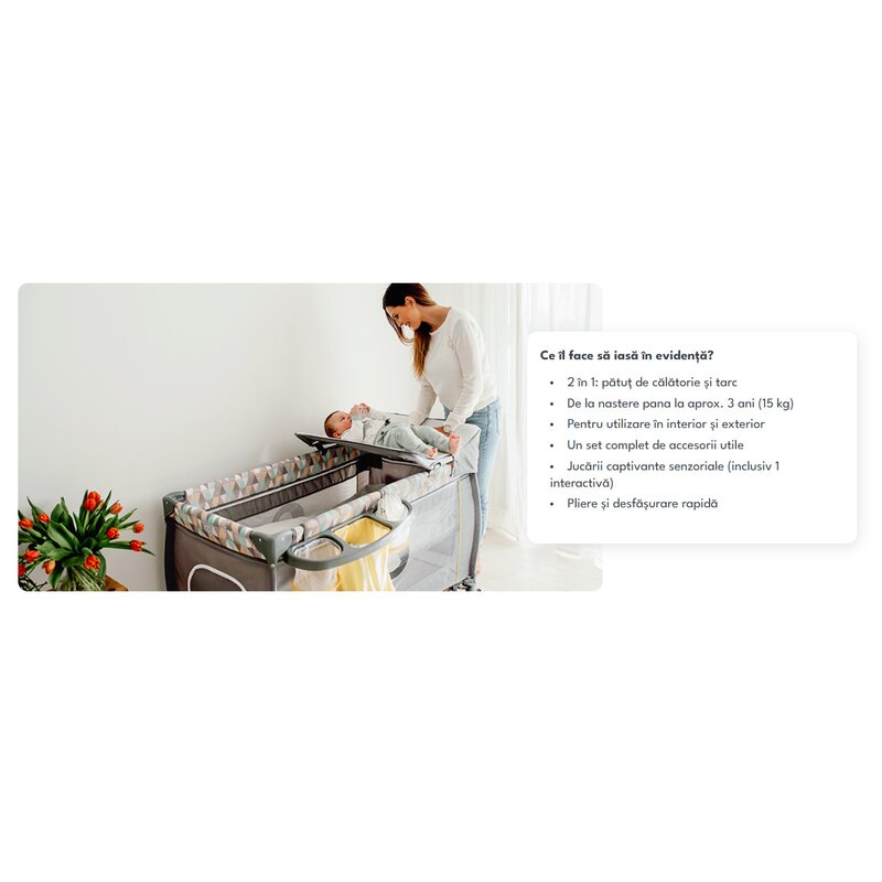 Bebelusul poate insoti parintii in activitatile de zi cu zi in toata casa. Constructia usoara si doua roti faciliteaza miscarea tarcului, in timp ce partile laterale din plasa permit contactul vizual intre copil si parinte (si asigura, de asemenea, o circulatie optima a aerului).