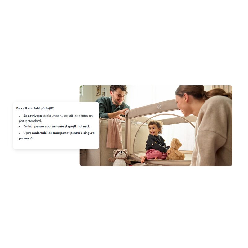 Tot ce trebuie sa faci este sa cobori laterala pentru confortul tau si patutul se transforma intr-o extensie practica. Astfel, poti fi aproape de micut in orice moment al zilei si al noptii. Curelele de montaj incluse permit fixarea sigura a patutului de patul parintilor, asigurand stabilitate maxima.