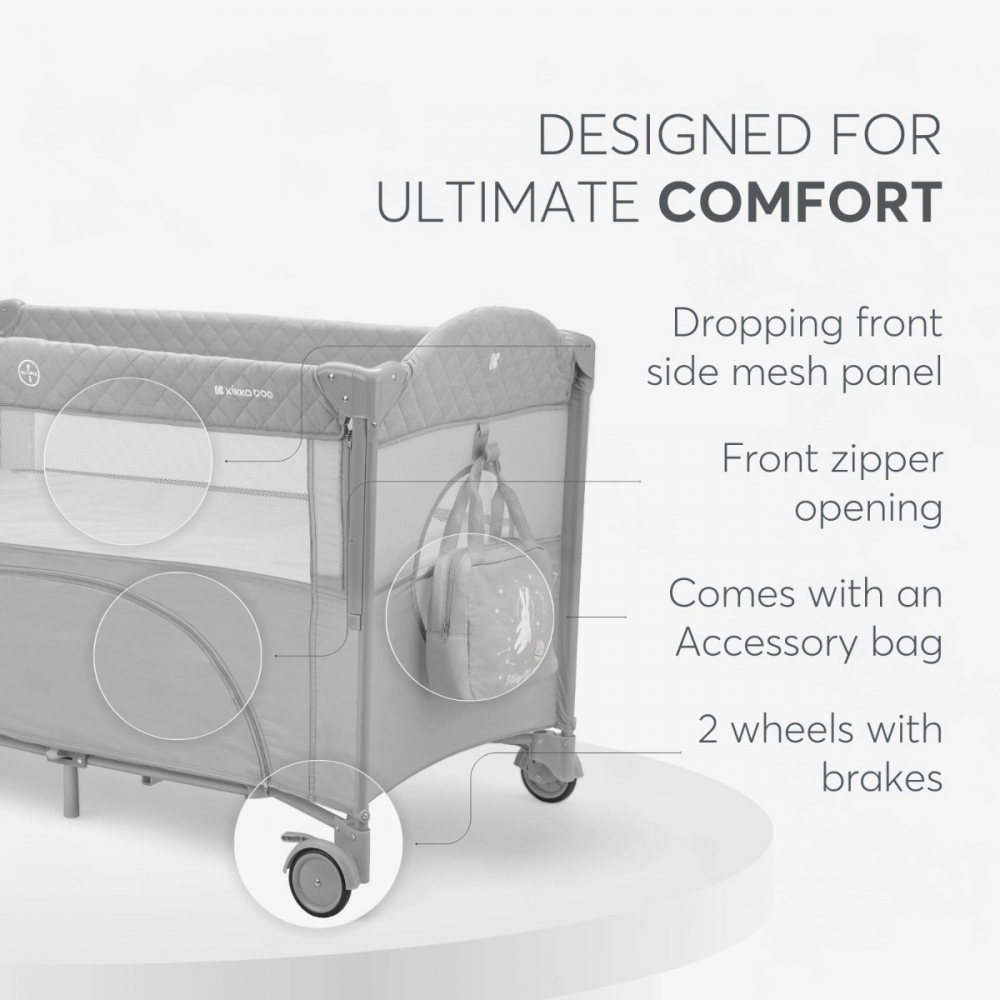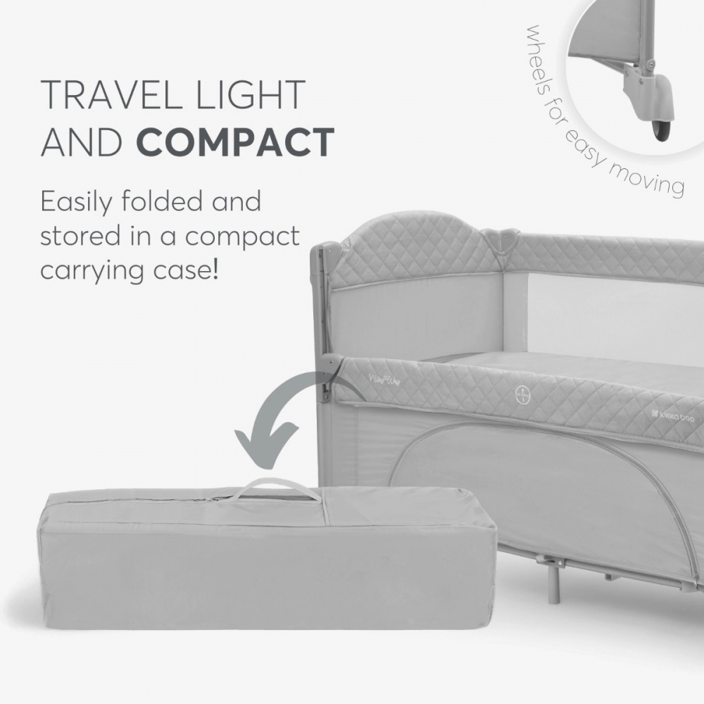 Patutul pliabil cu laterala culisanta KikkaBoo Milky Way se potriveste perfect pentru calatorie si acasa datorita rotilor utile pentru mutarea acestuia dar si plierii compacte cu geanta de transport.