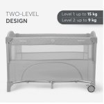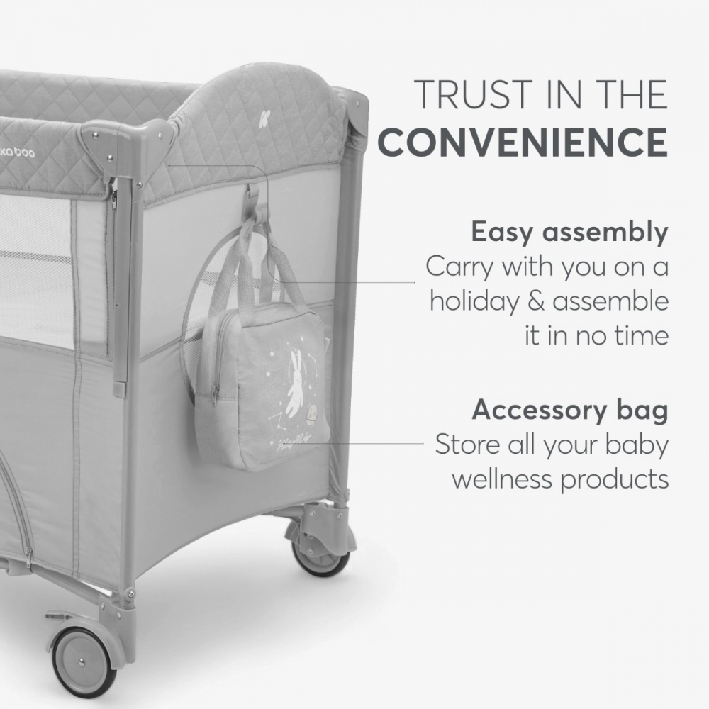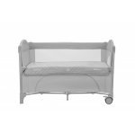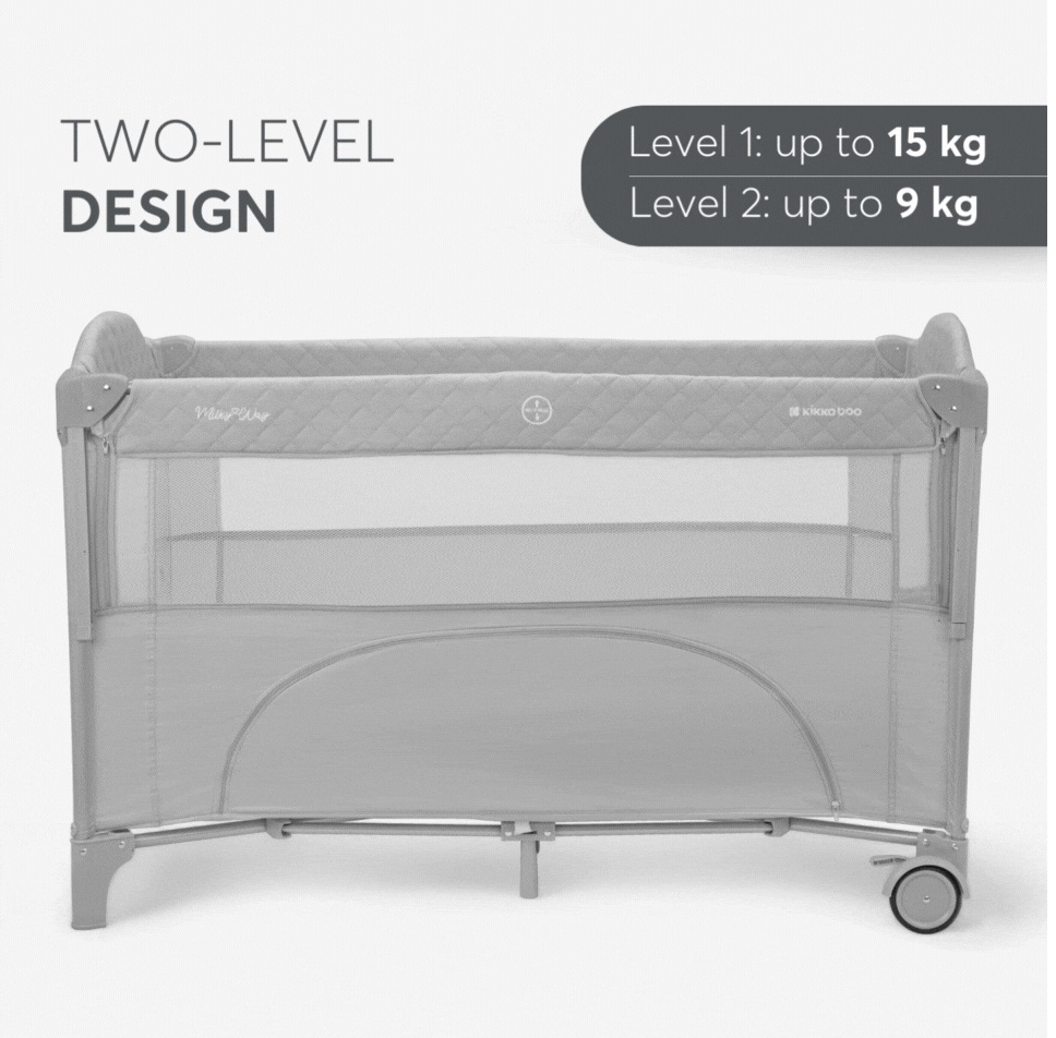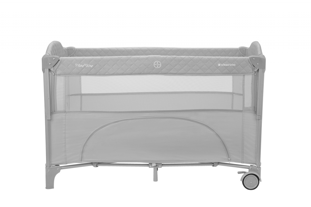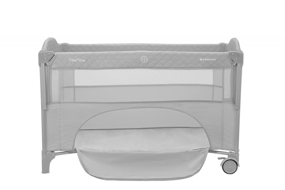 Patut pliabil pentru copii KikkaBoo Milky Way Grey cu 2 nivele,laterala culisanta pe 3 nivele,pliere compacta,usa cu fermoar,roti cu frane,curea de fixare pat,saltea pliabila,gentuta organizator si geanta transport incluse