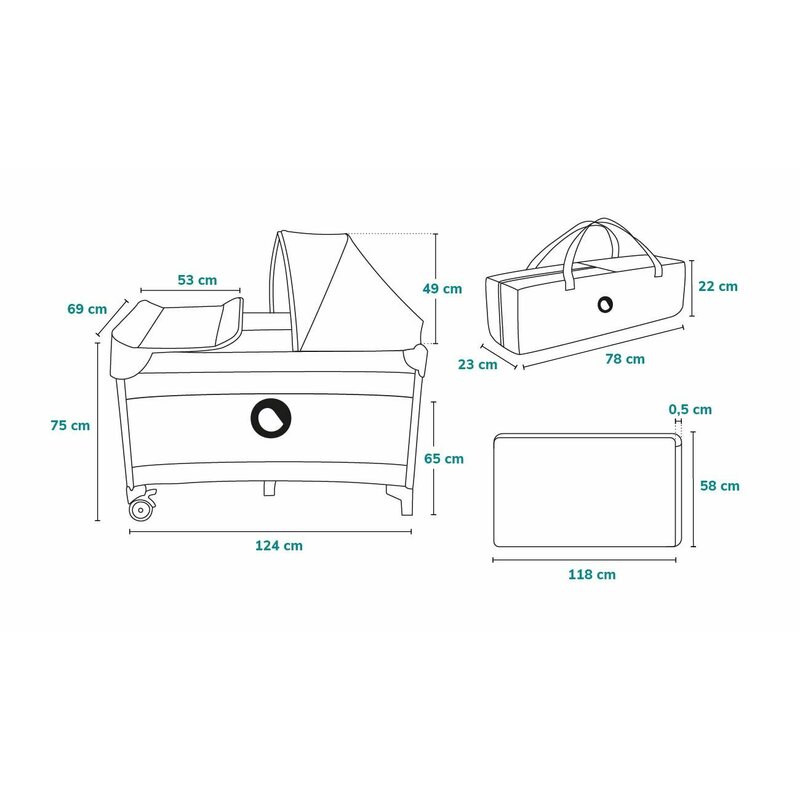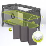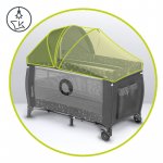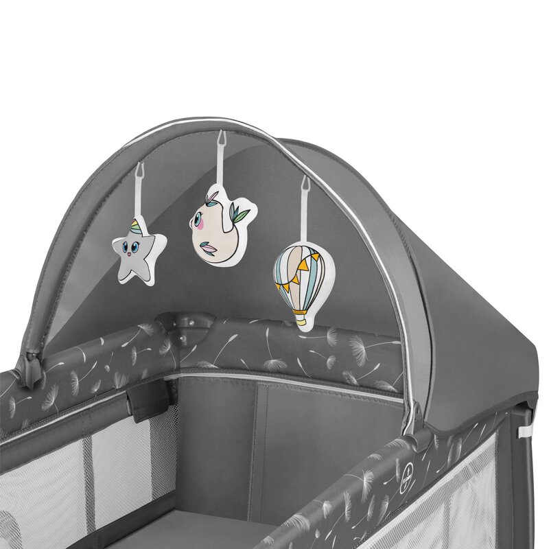 Copertina functionala (cu 3 jucarii captivante) va protejeaza bebelusul de lumina soarelui si de stimuli inutili, iar plasa de tantari inclusa va protejeaza impotriva insectelor. Asadar, patutul de copii poate fi folosit si in aer liber atunci cand temperatura o permite.