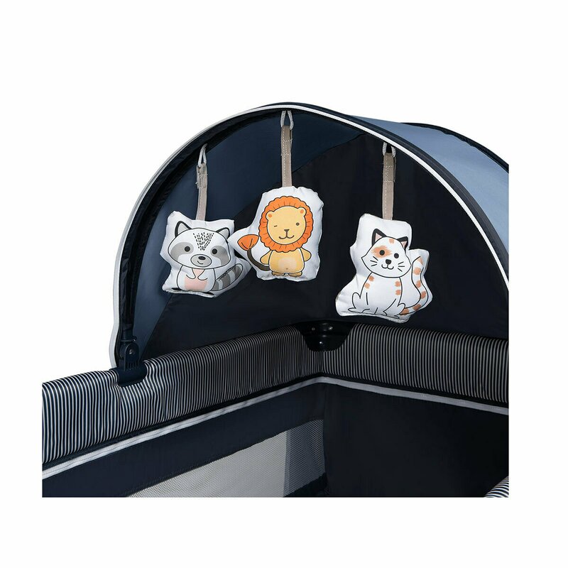 Copertina functionala (cu 3 jucarii captivante) va protejeaza bebelusul de lumina soarelui si de stimuli inutili, iar plasa de tantari inclusa va protejeaza impotriva insectelor. Asadar, patutul de copii poate fi folosit si in aer liber atunci cand temperatura o permite.
