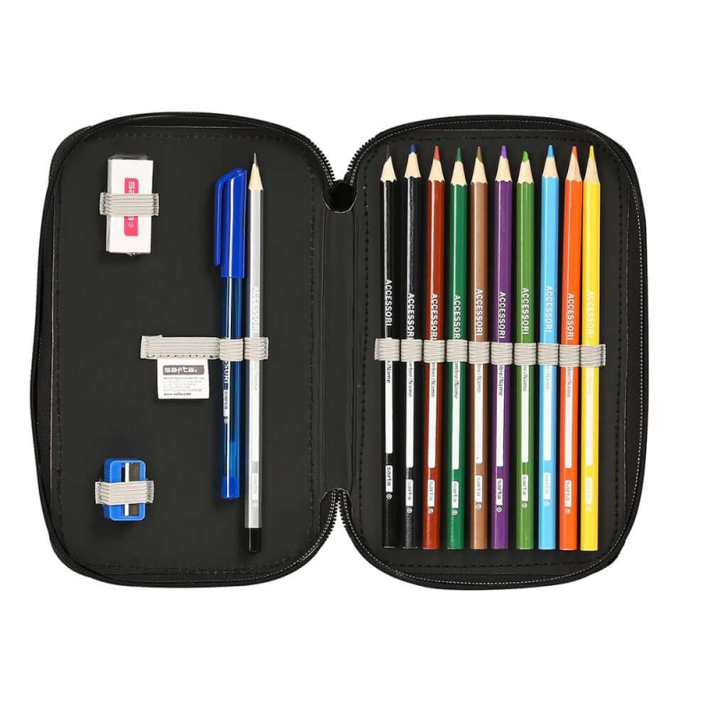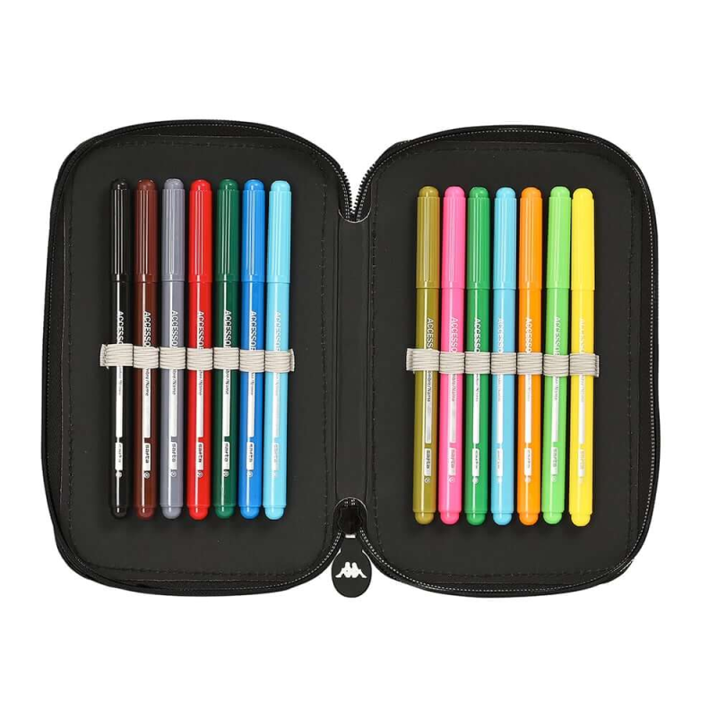 Kappa Penarul dublu echipat 28 piese Kappacontine: in primul compartiment sunt : 10 creionare colorate, 1 pix, 1 creion, 1 radiera si 1 ascutitoare, iar in cel de-al doilea compartiment contine 14 carioci colorate.