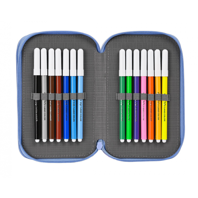 - Primul compartiment este echipat cu un creion, un pix, o ascutitoare, o guma de sters si 10 creioane colorate iar al doilea compartiment este echipat cu 14 markere asortate.