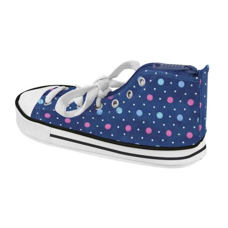 Penarul in forma de pantof sport Safta buline bleu are un design inedit, in nuante de albastru, bleu si roz.