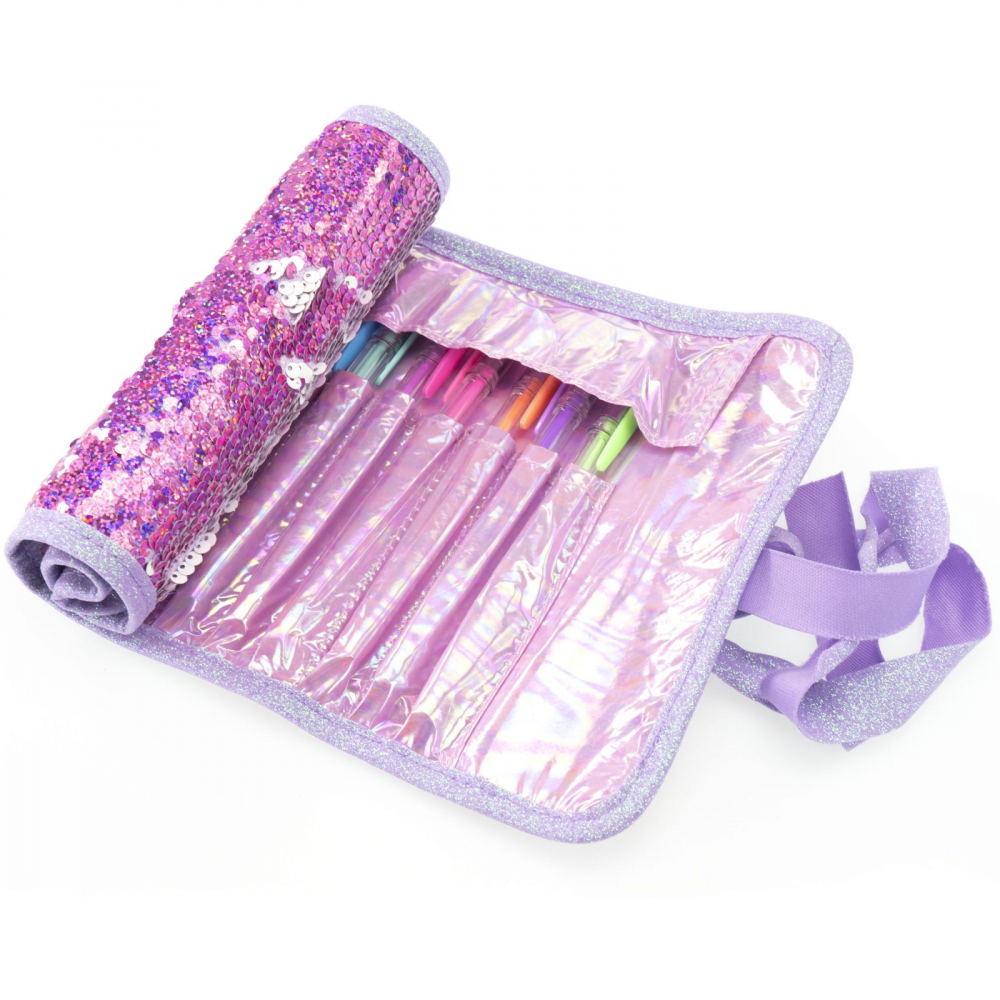 Realizat din material matlasat cu efect irizat și decorat cu paiete reversibile, acest penar tip roll conține un set complet de instrumente creative: 12 pixuri gel colorate și 6 markere cu vârf dublu.