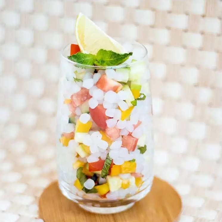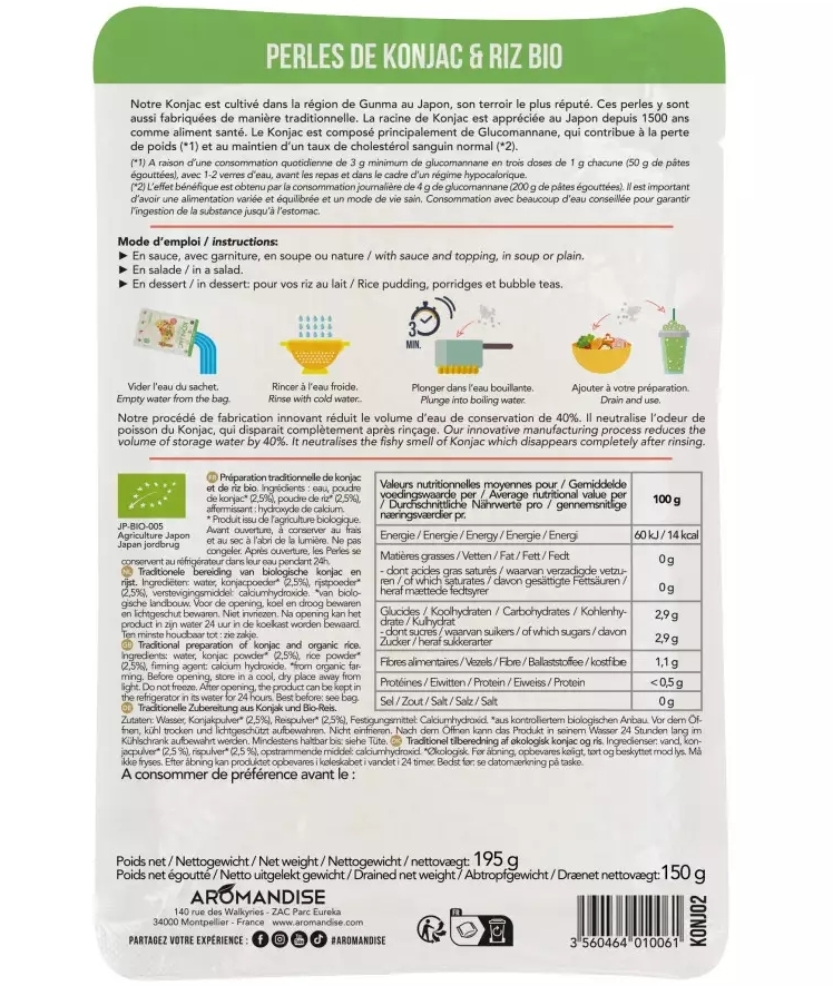 Konjac este combinat cu orez pentru a face perlele mai gustoase si textura lor mai frageda.