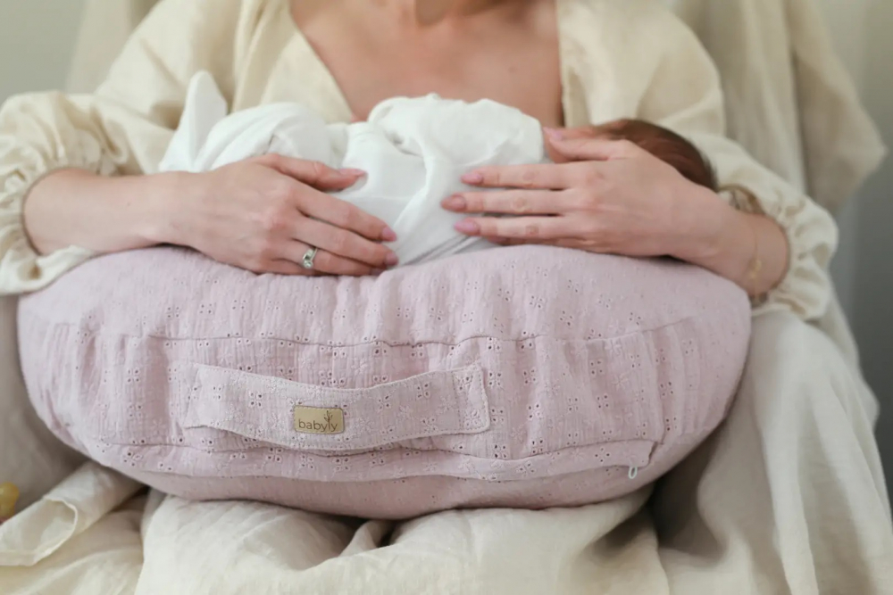 Perna BabyLy pentru gravide si alaptare bumbac brodat si umplutura ferma antialergica Big cu maner roz