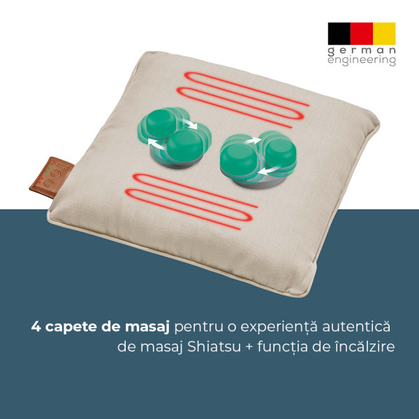 Fiindcă funcționează pe bază de acumulator, această pernă poate să fie folosită cu ușurință oriunde, în călătorii, în mașină, la birou, acasă sau pe terasă. Are integrată funcția de masaj Shiatsu cu 4 capete care se rotesc în pereche și funcția de încălzire în 2 trepte.