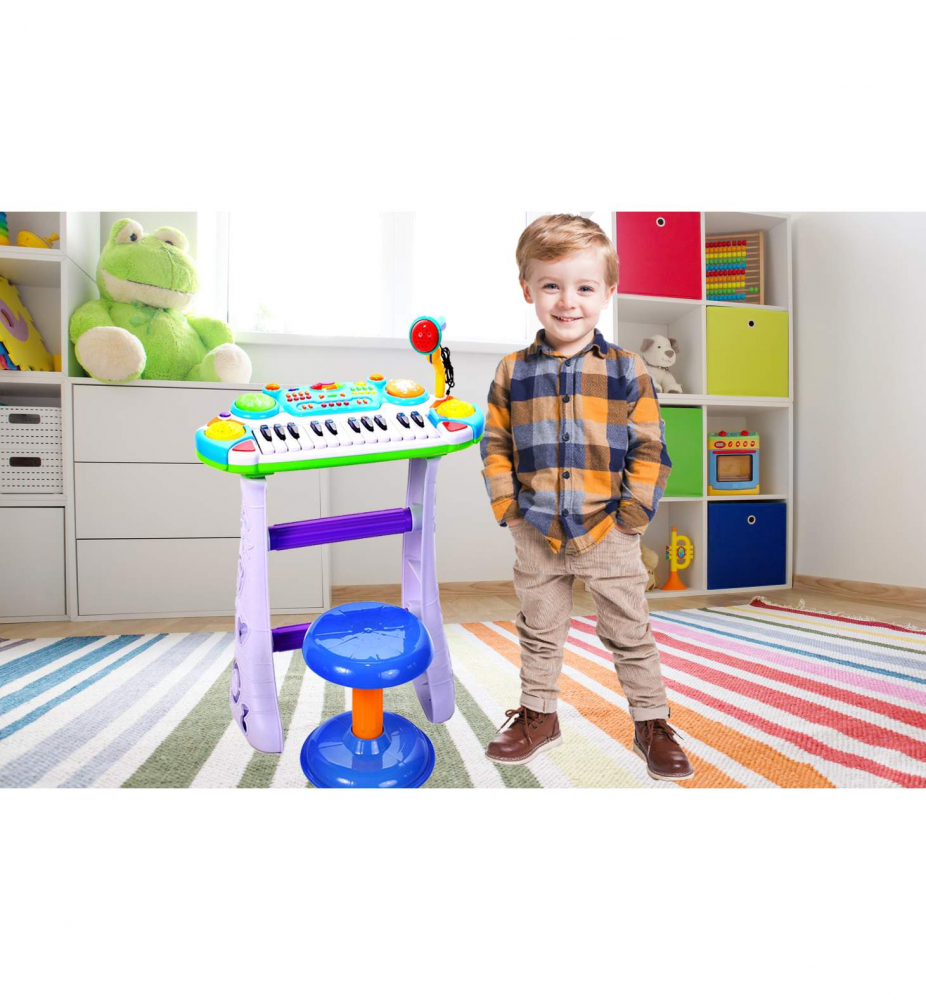 Sintetizatorul electronic este o combinatie de distractie deosebita cu învatarea si explorarea lumii muzicii. Este un decor fantastic pentru un mic virtuoz care intra în lumea muzicii si a sunetelor. Echipamentele bogate va ofera posibilitati nelimitate. Orga are sunete placute si culori vii. Redarea cu muzica a început de la o varsta frageda aduce cele mai bune rezultate. Copilul învata lumea atat prin observarea mediului înconjurator, cat si prin propriile sale experiente. Jocul cu tastatura stimuleaza creativitatea copilului tau si dezvolta perfect abilitatile manuale si muzicale. Mai mult, va oferi o multime de distractie. Tastatura are un numar încorporat de functii foarte interesante, care vor atrage fiecare copil mic. Tastatura este o jucarie excelenta pentru toti cei carora le place muzica.