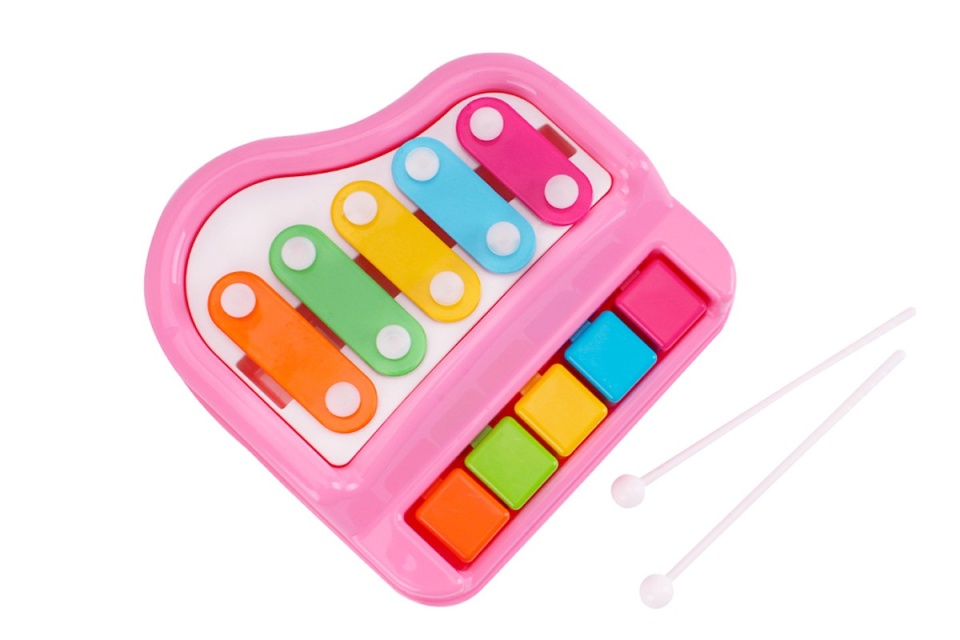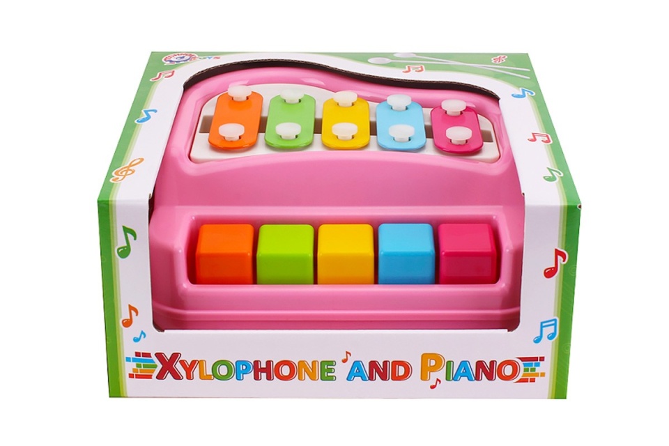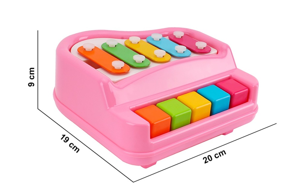Jucăria combină două instrumente muzicale: un xilofon și un pian cu clape.