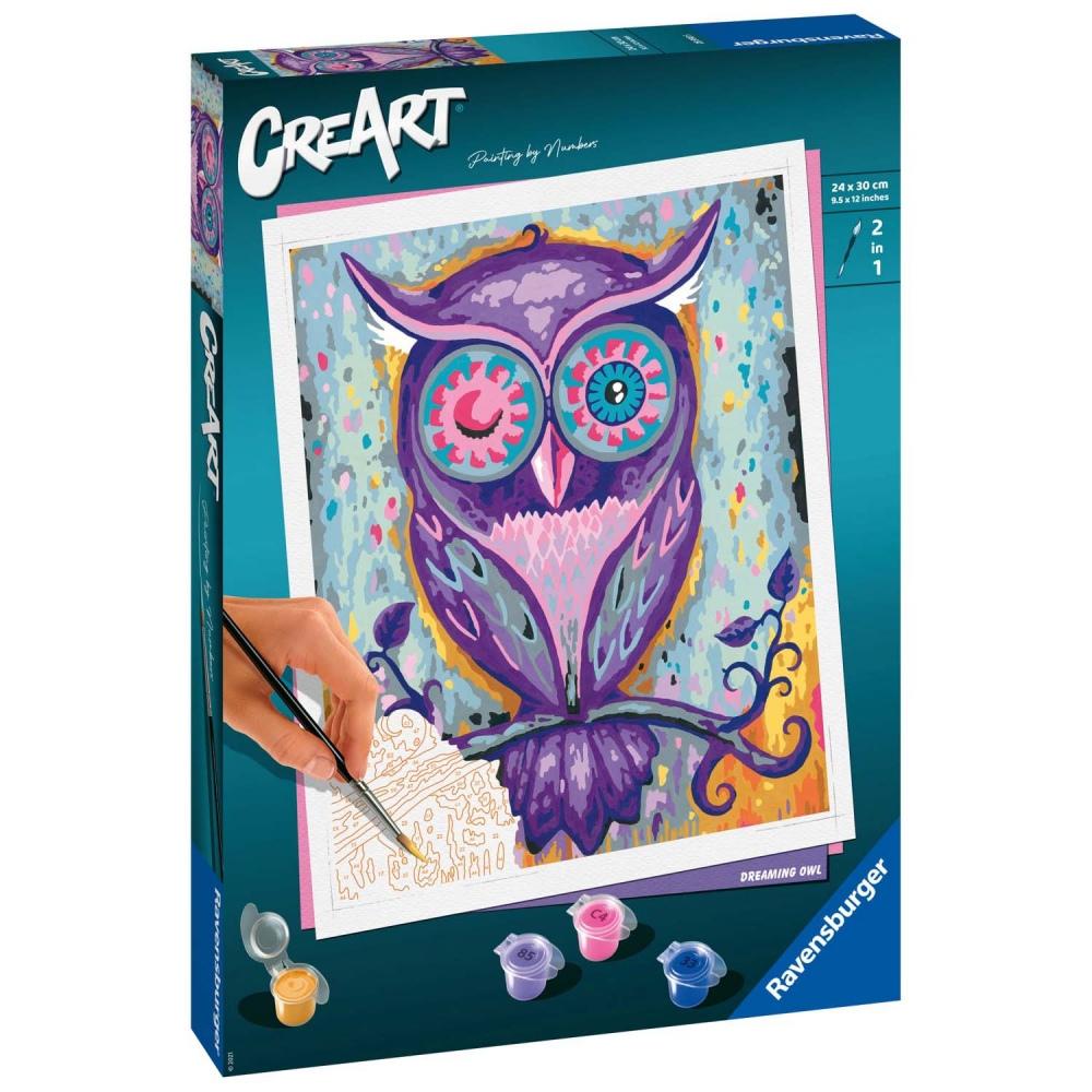 Setul include: Plansa de pictat cu numere; vopsele acrilice, pensula si o paleta pentru culori.