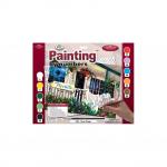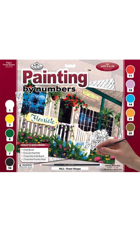 Setul de pictura pe numere contine un sabloan cu tema "Florarie", 10 borcanele cu vopsea acrilica numerotate, 1 pensula Taklon .