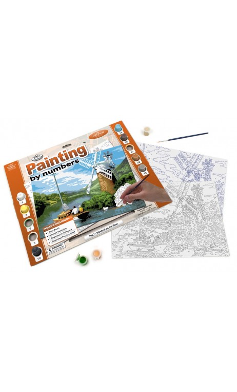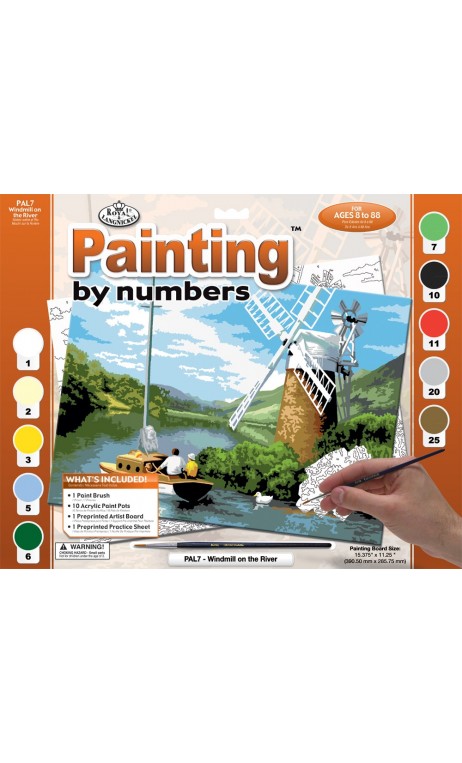 Setul de pictura pe numere contine un sabloan cu tema "Moara de apa", 10 borcanele cu vopsea acrilica numerotate, 1 pensula Taklon .