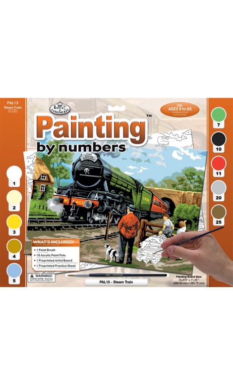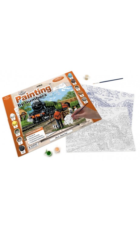 Setul de pictura pe numere contine un sabloan cu tema "Trenul", 10 borcanele cu vopsea acrilica numerotate, 1 pensula Taklon .