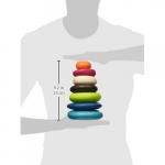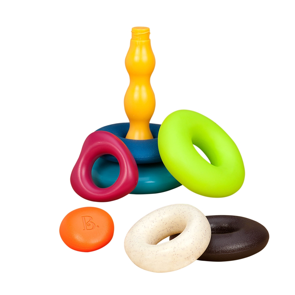 Jucarie B.Toys in forma de piramida cu 5 inele din plastic cu texturi si culori diferite.