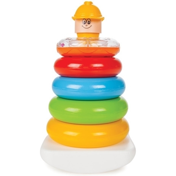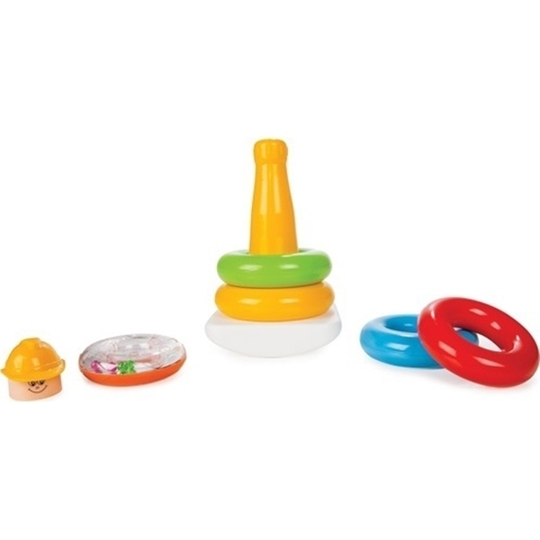 * Piramida inelelor amuzante are cinci inele si o baza special concepute pentru a fi usor de manevrat de catre bebelus. Inelul superior are in interior bilute ce se misca pe o suprafata colorata, astfel bebelusul este atras de zornaitul bilutelor