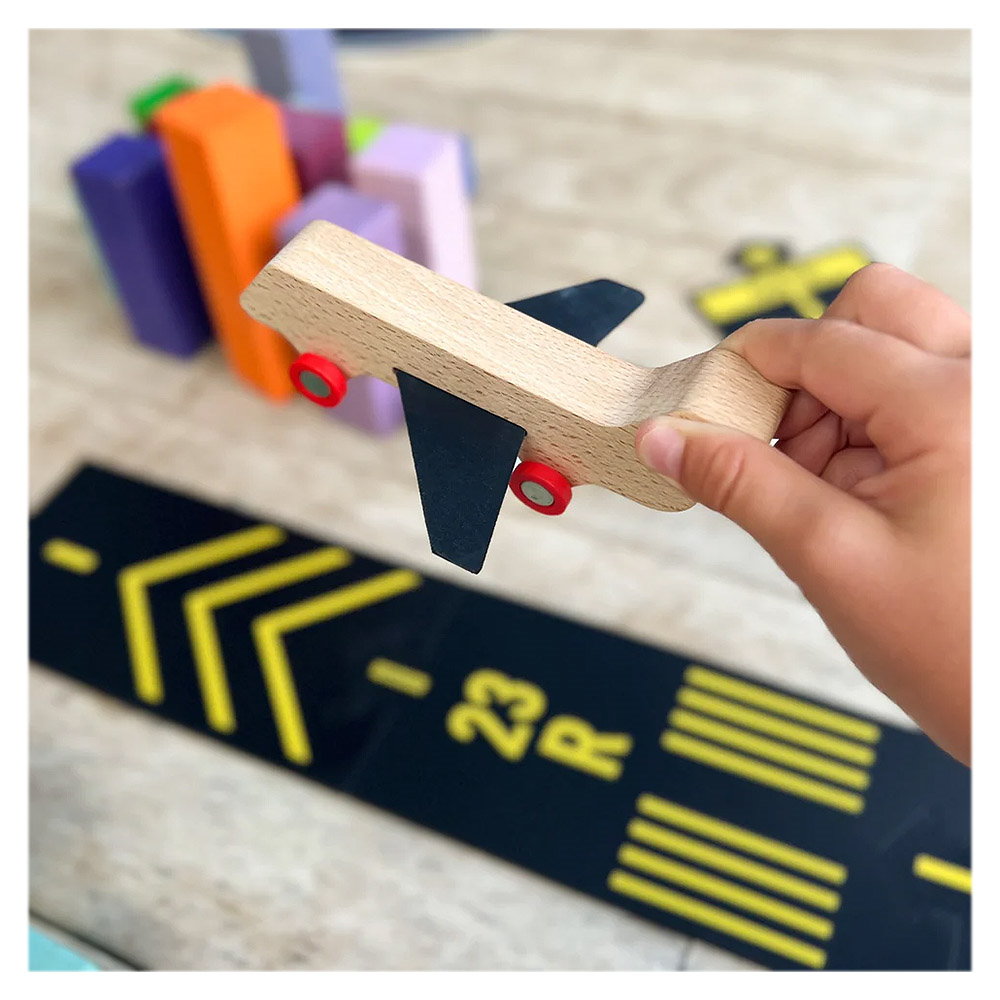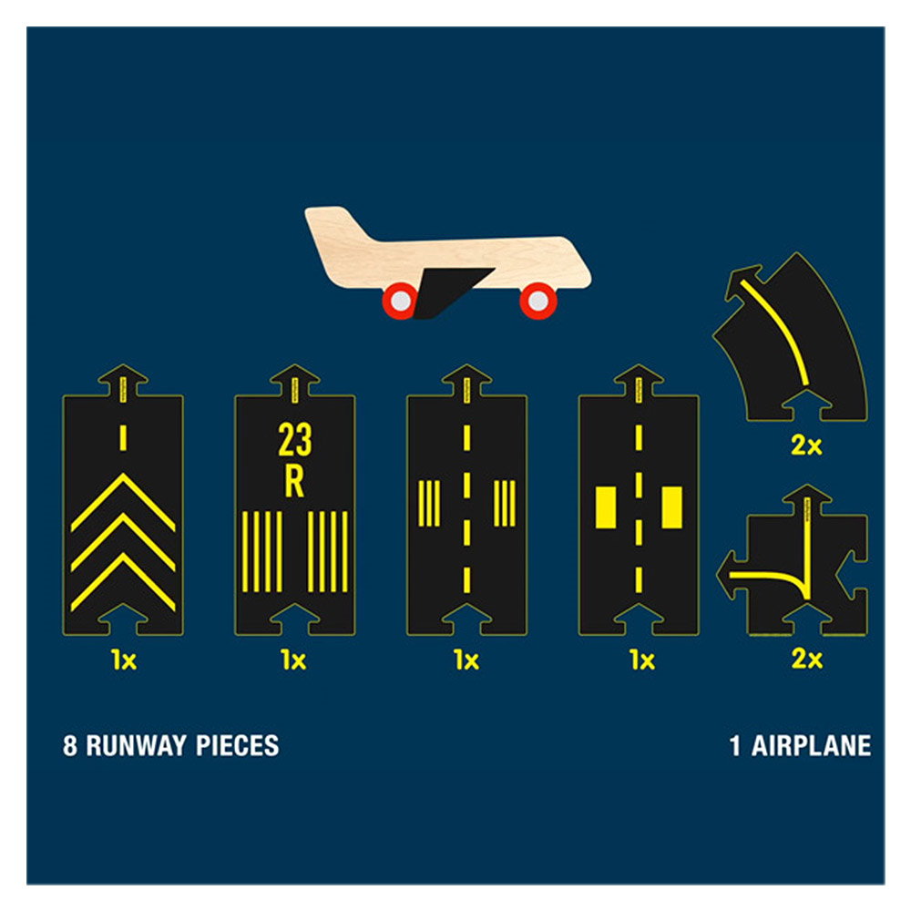 • Setul Runway include 8 piese din cauciuc sintetic flexibil: 4 segmente drepte, 2 segmente curbe, 2 intersectii si 1 avion handmade din lemn.
