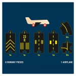 • Acest set tematic de la Waytoplay contine 8 piese din cauciuc flexibil imprimate cu elemente grafice galbene, pentru a reda marcaje specifice aeroporturilor, cum ar fi caile de rulare, pistele de decolare si de aterizare si portile de acces.