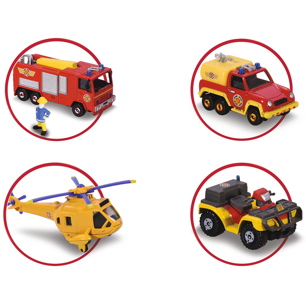 Detalii Pista de masini Dickie Toys Fireman Sam Rescue Team Sam Fire cu 3 masinute, 1 elicopter si o figurina