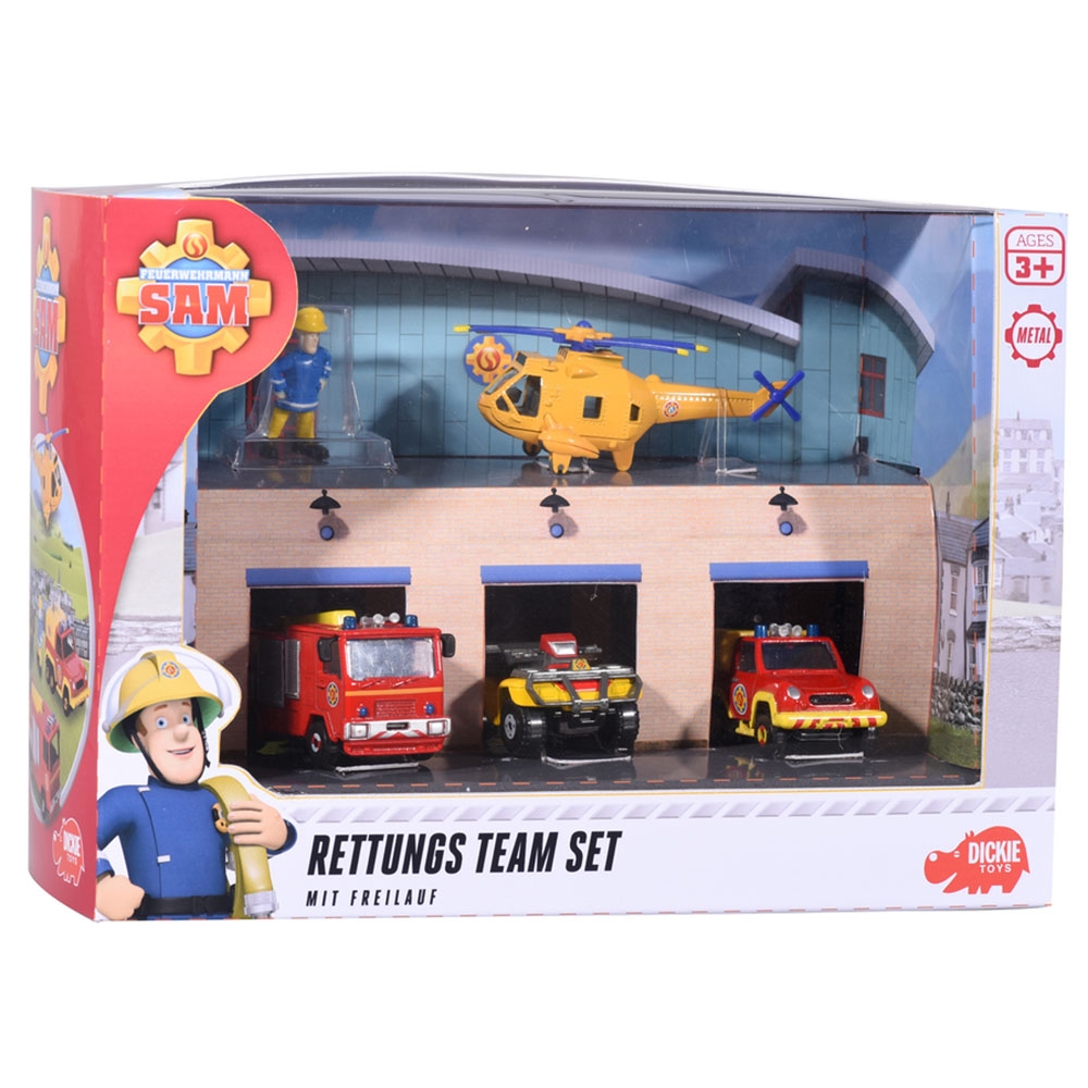Pista de masini Fireman Sam Rescue Team Sam Fire cu 3 masinute 1 elicopter si o figurina Dickie Toys