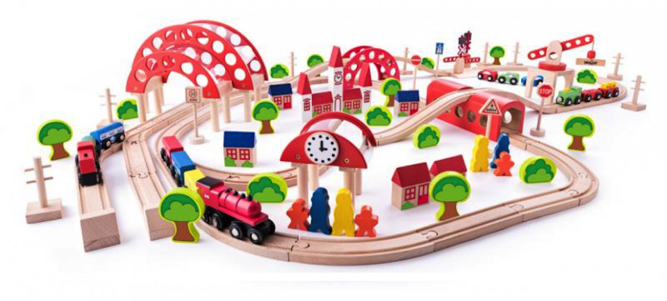 Pista de tren contine 130 de piese, foarte multe accesorii din lemn: copaci, figuri, cladiri, indicatoare, dar mai ales un numar mare de piese, pe care copilul le poate asambla dupa instructiuni sau dupa propriile idei.