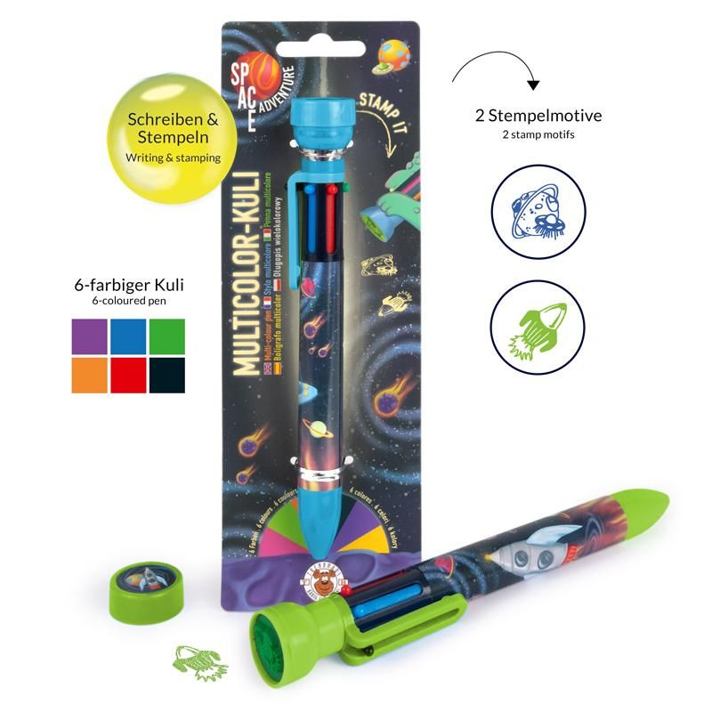 Cu acest pix multicolor nu numai ca poti scrie in 6 culori diferite (roz, verde, portocaliu, negru, mov, galben), dar si stampila un motiv super cool cu design spatiu!