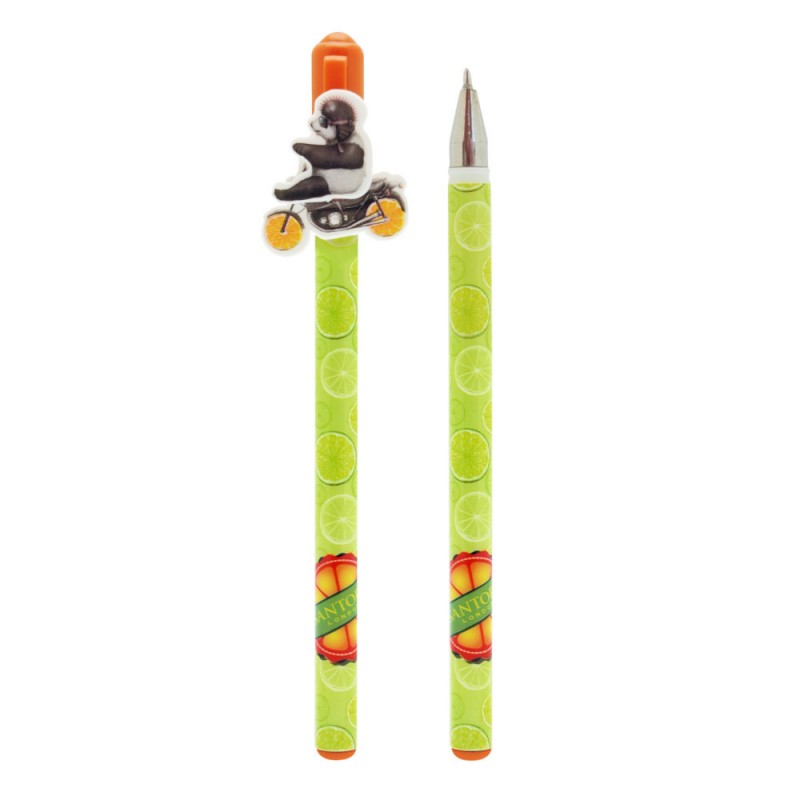 Capacul pixului este prevazut cu o figurina ursulet panda ce calatoreste pe o motocicleta cu roti din portoclae care, in momentul in care este agitarii pixului, se misca.